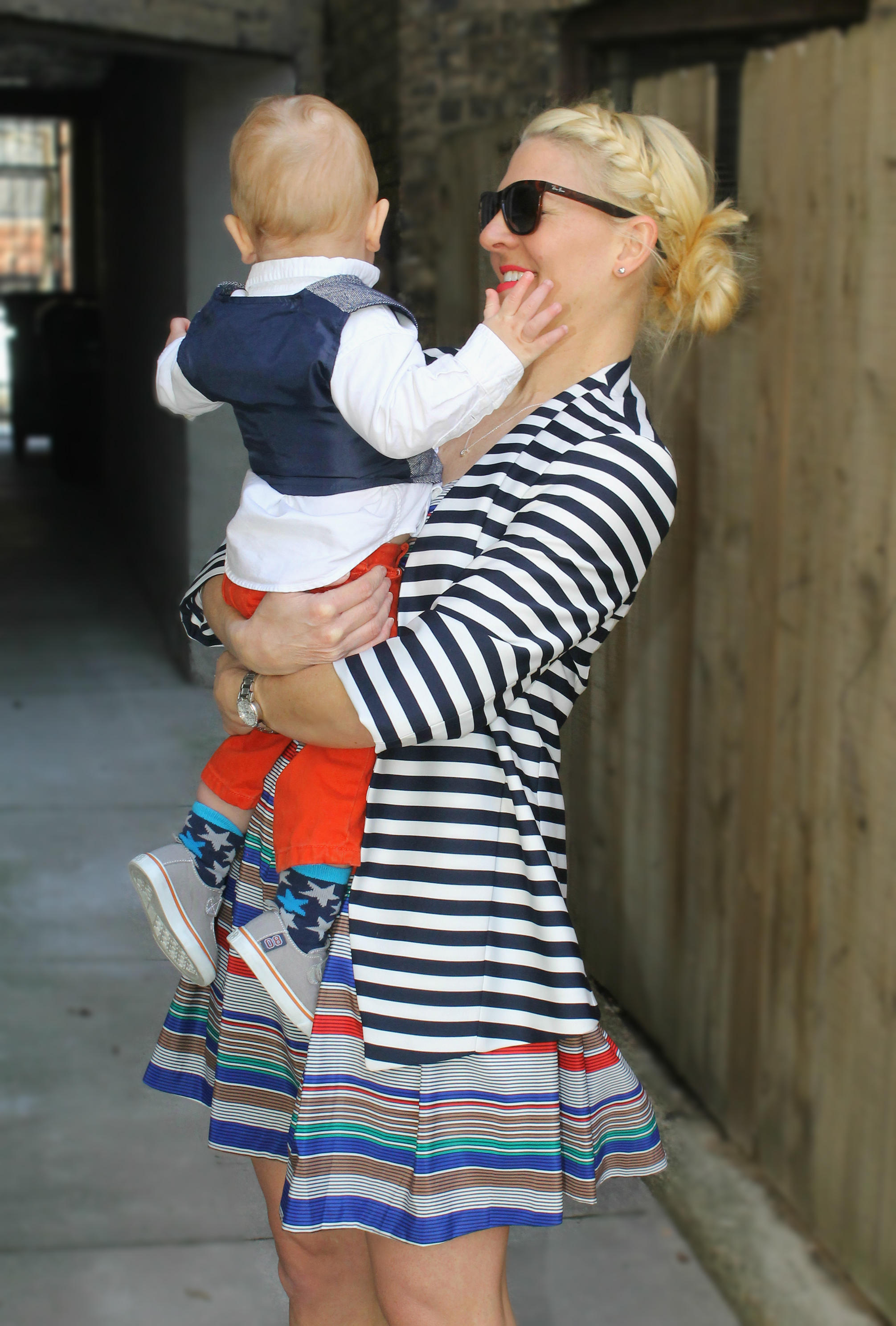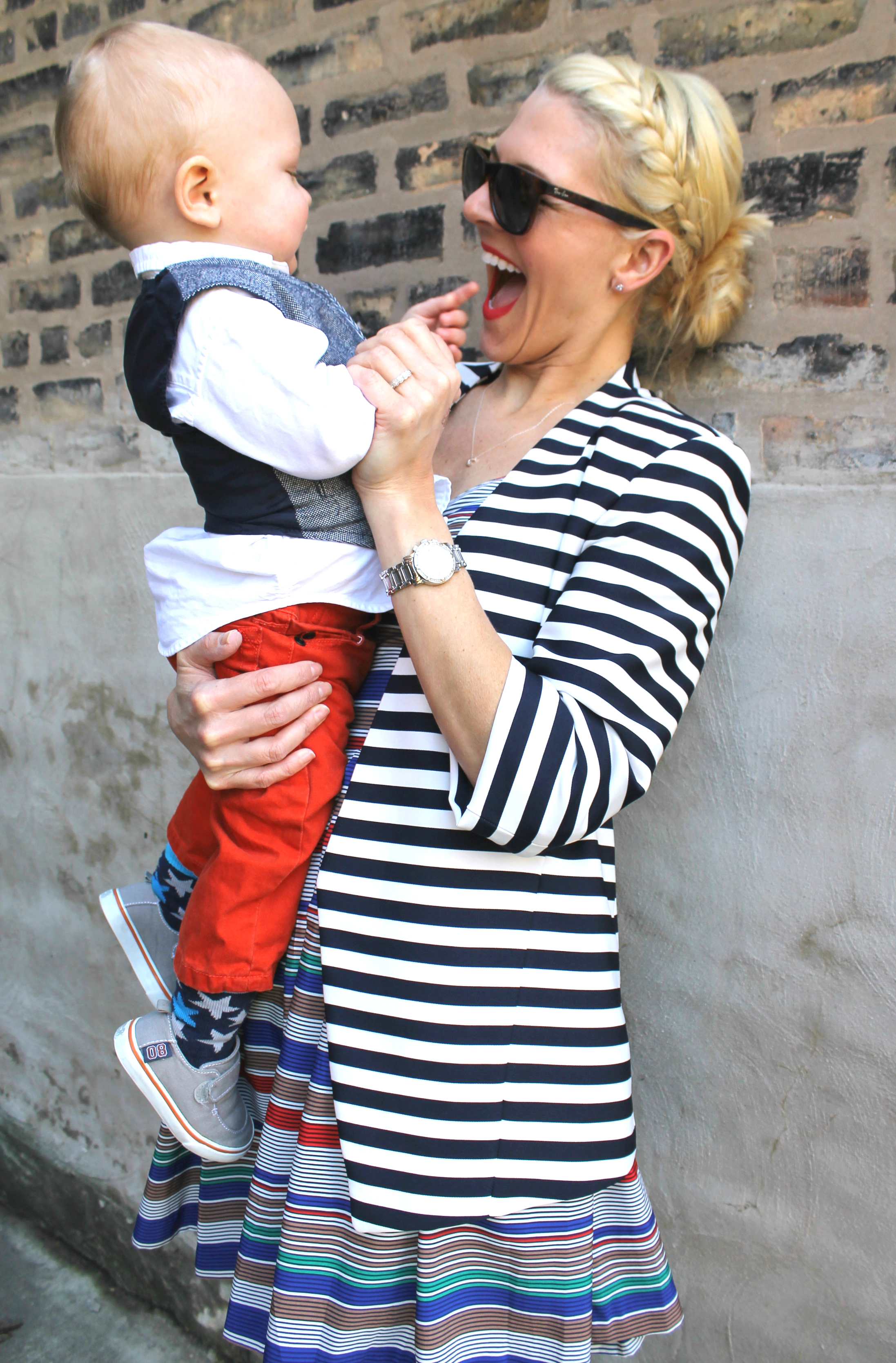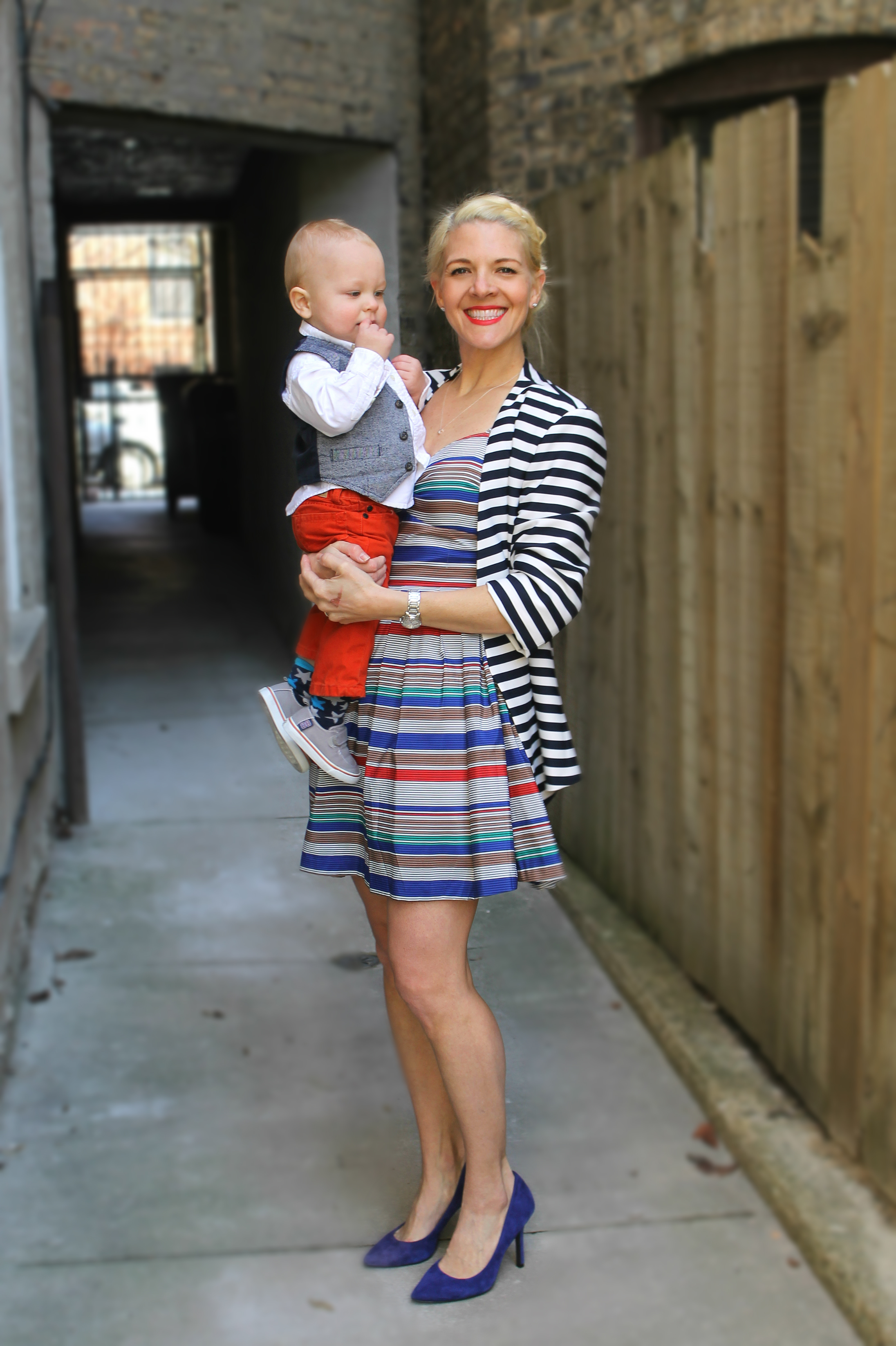 I’m also breaking another ‘rule’ today – my blazer is navy and white and my dress is actually teeny black lines over-layed with color stripes. I tend to think navy and black look great together, so I don’t really consider this a rule at all especially when there’s this much going on in an outfit. I put my little man in solids, because I have to draw the line somewhere. Oh and yes, I’m PLATINUM now!