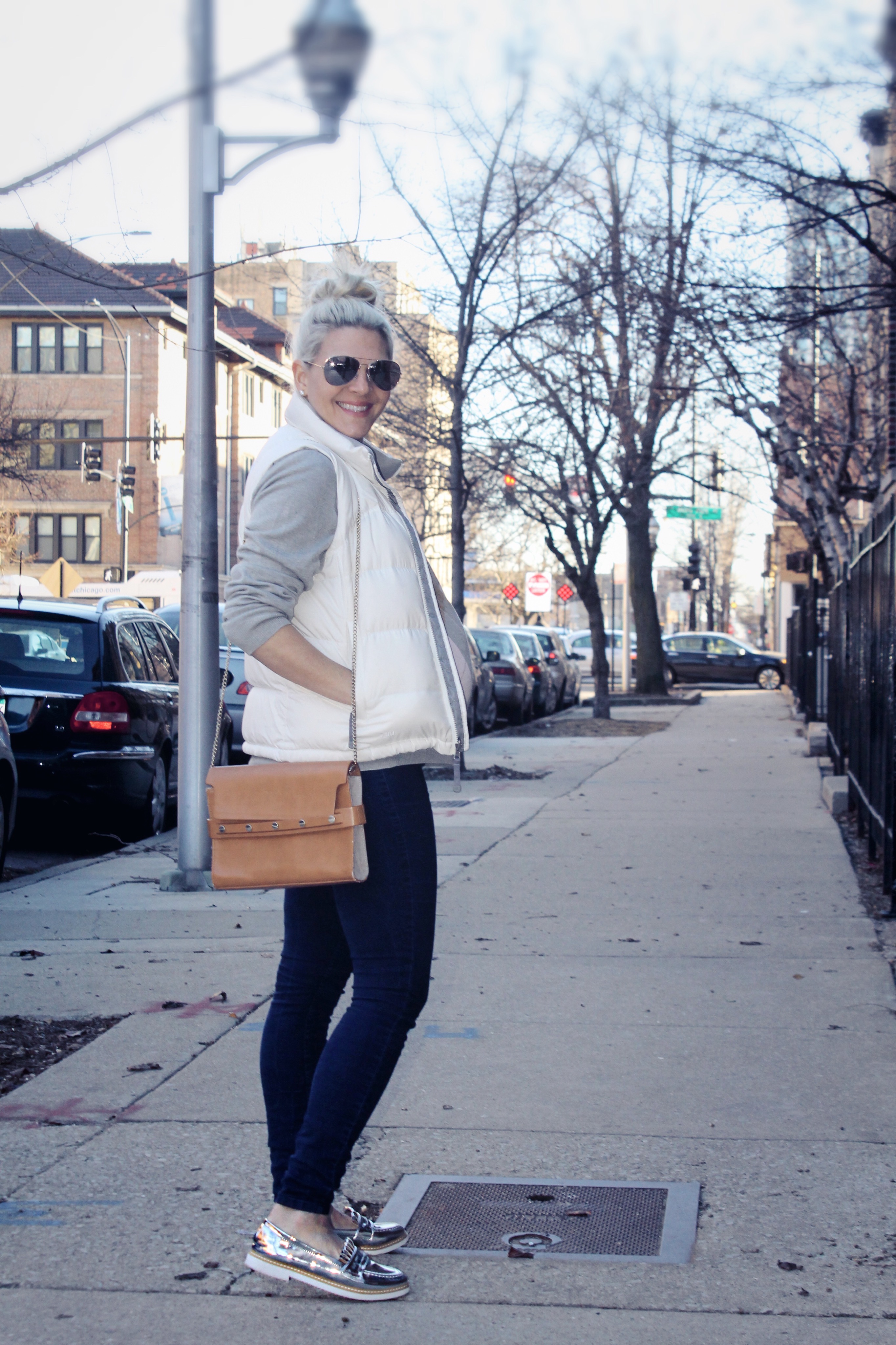 To complete the look, I added a thrifted Northface vest that I hunted for $15, because while unseasonably warm, it’s still February in Chicago. I accessorized with the brightest, shiniest items I could find which includes: my Target mirror aviators and cz studs, and thrifted sterling silver leaf and initial necklaces. My purse is a thrifted Zara cross body that picks up the brown in the sweater. Hair in a top knot, because ain’t nobody got time for a blow out on a Sunday.