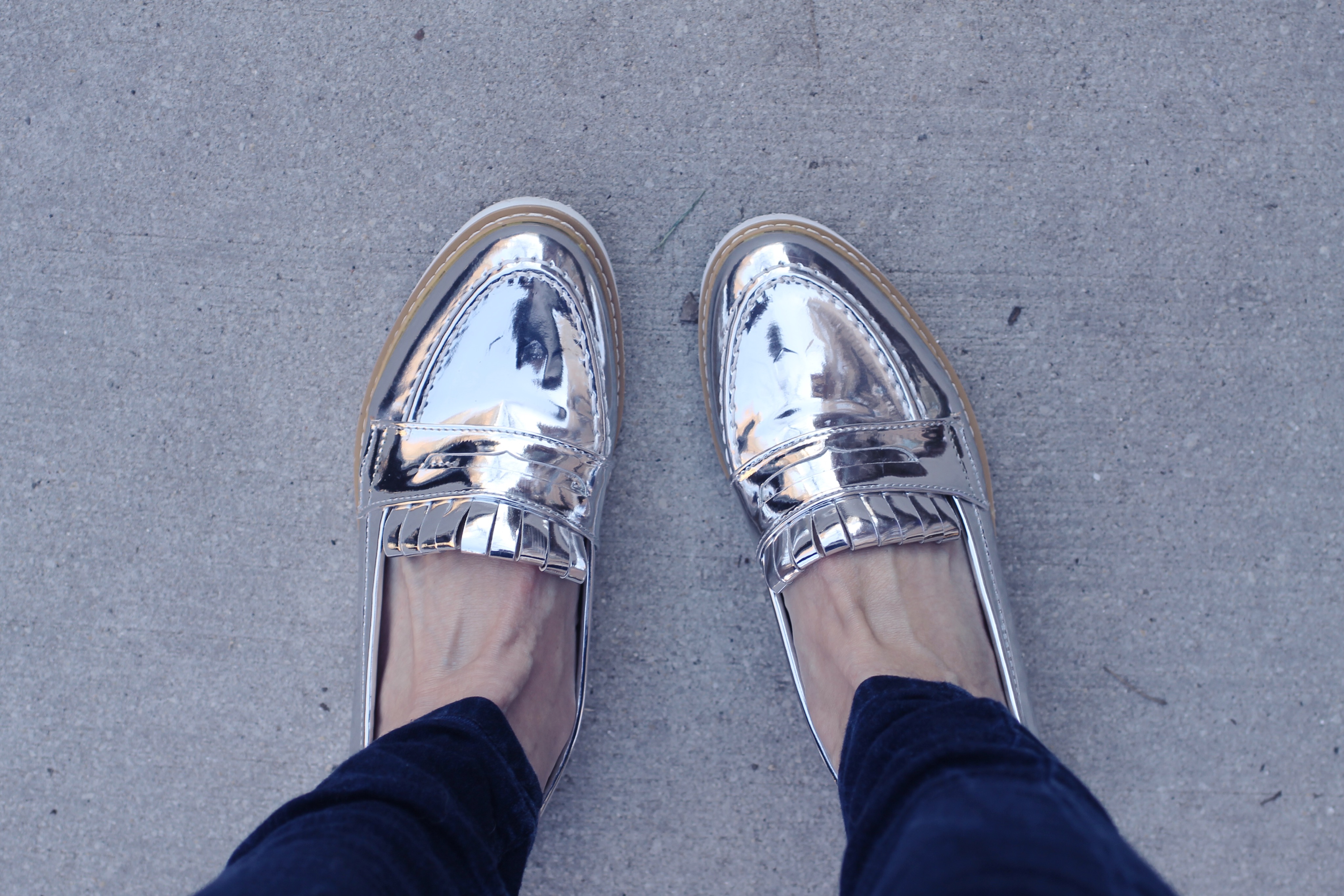My favorite thing about these bad boys, besides the blinding material, is that they’re light weight and flexible. I’ve tried on many metallic loafers in ‘real’ stores, and they are always really heavy and stiff. Clomping around completely flat footed is never a good look. In these I feel like I can walk like a normal human which is key. I paid $10.99 for them which is fair since they have never been worn.