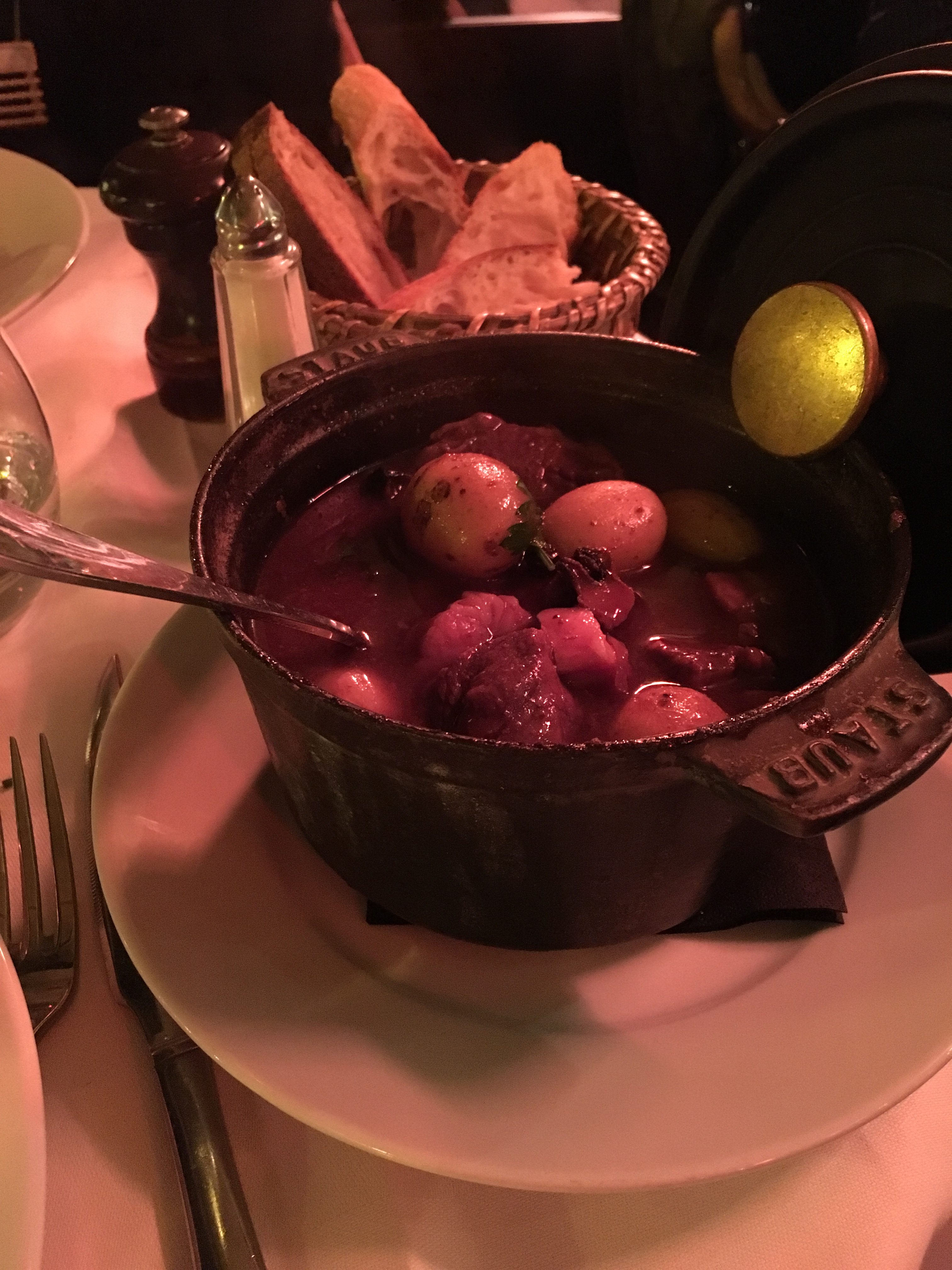 Main course – I ordered beef bourguignon (how could I not?) and my mom ordered a white fish in a butter saffron sauce. The beef bourguignon was absolutely one of the best things I have ever tasted. Served in my own little personal cast iron pot, it was rich, tender and super hot. The fish was also extremely good – delicate and flavorful.
