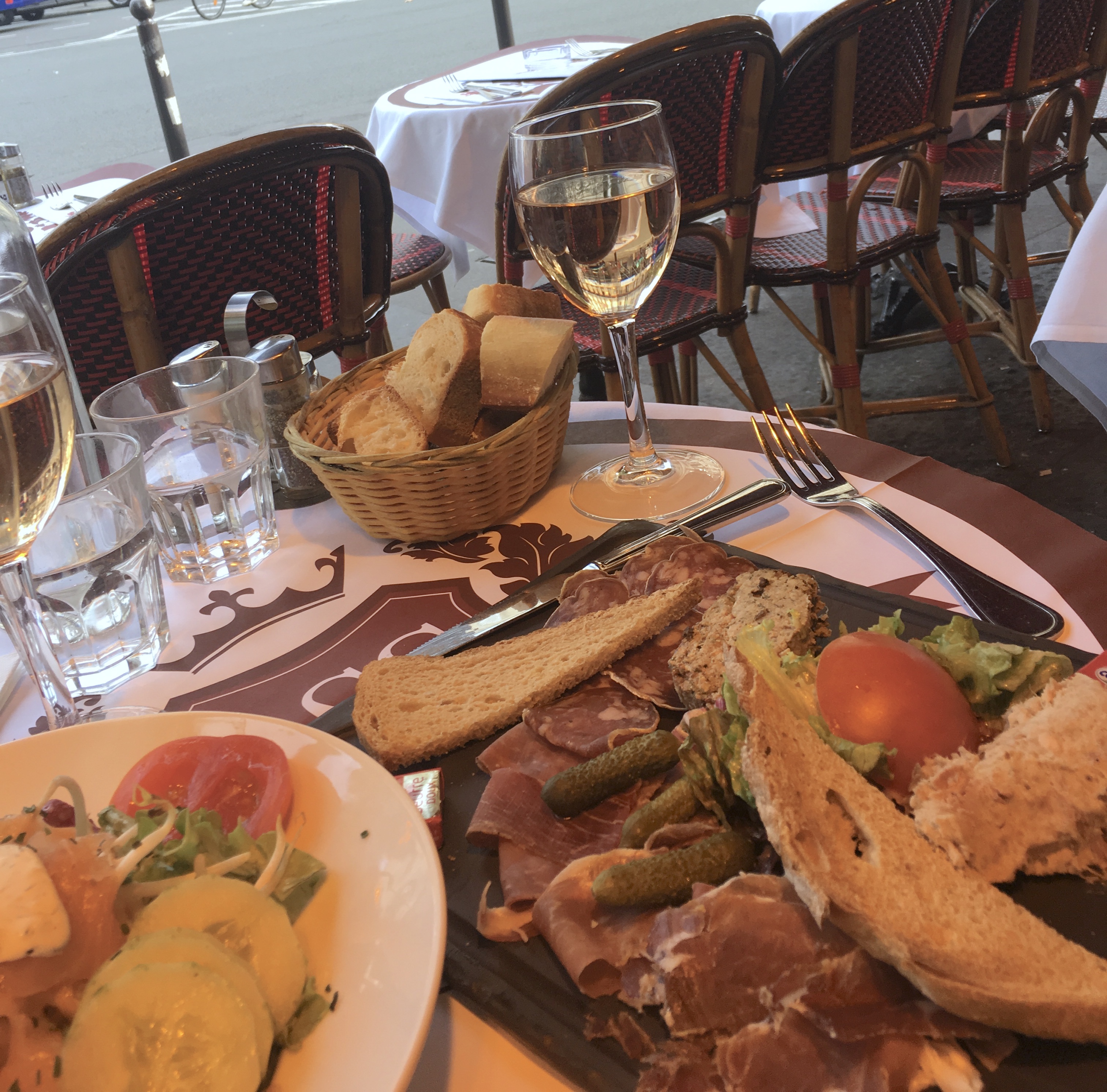 For lunch, we parked ourselves under a heat lamp at cafe Le Saint Germain. We ordered two glasses of rose and shared a charcuterie plate (not everything was, but we ate it!), and a salad nicoise. Pronouced nee-suahz), this is composed salad, like a cobb salad in the US, but made with tuna, green beans, hardboiled eggs, tomatoes, onion, capers, and potatoes. Mmmmmm.