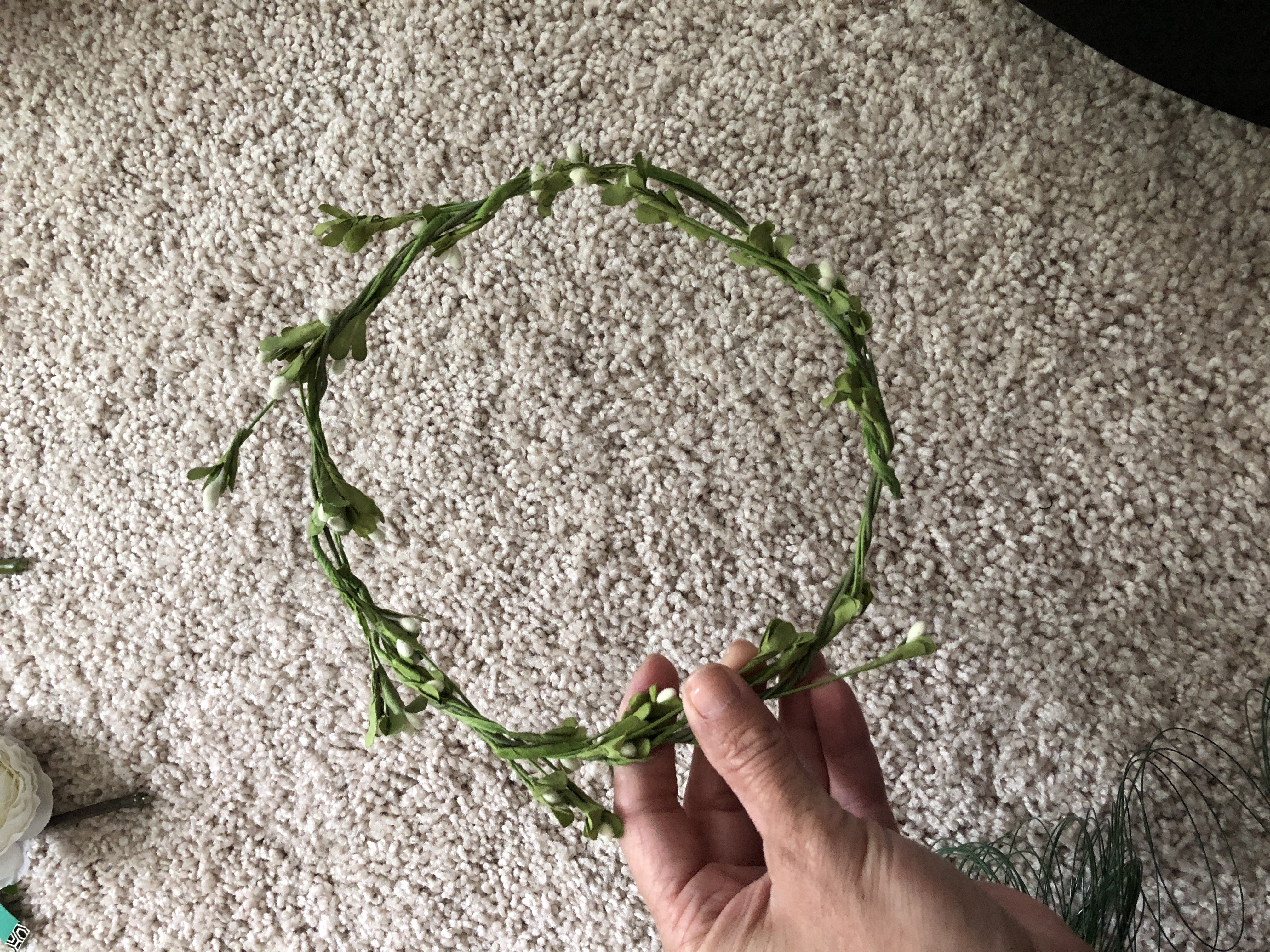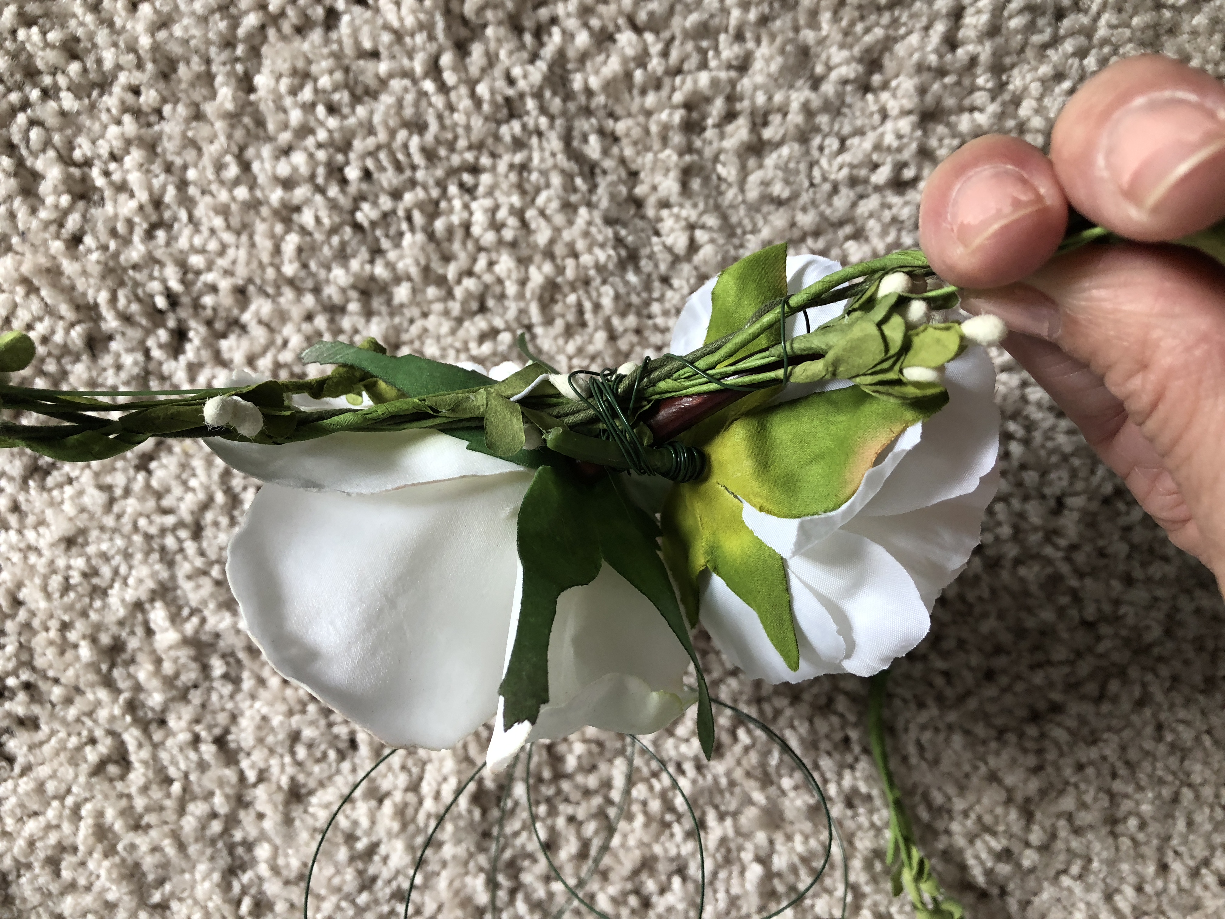 - Build the base with the stem wire – Make a circle that will sit nicely on your head by curving two pieces of wire and wrapping the ends together. Note: Once you add the flowers it will be tighter, so make it slightly bigger than you want the final product to be. If you mess this up like I did, it’s not the end of the world. It will just sit a bit higher.