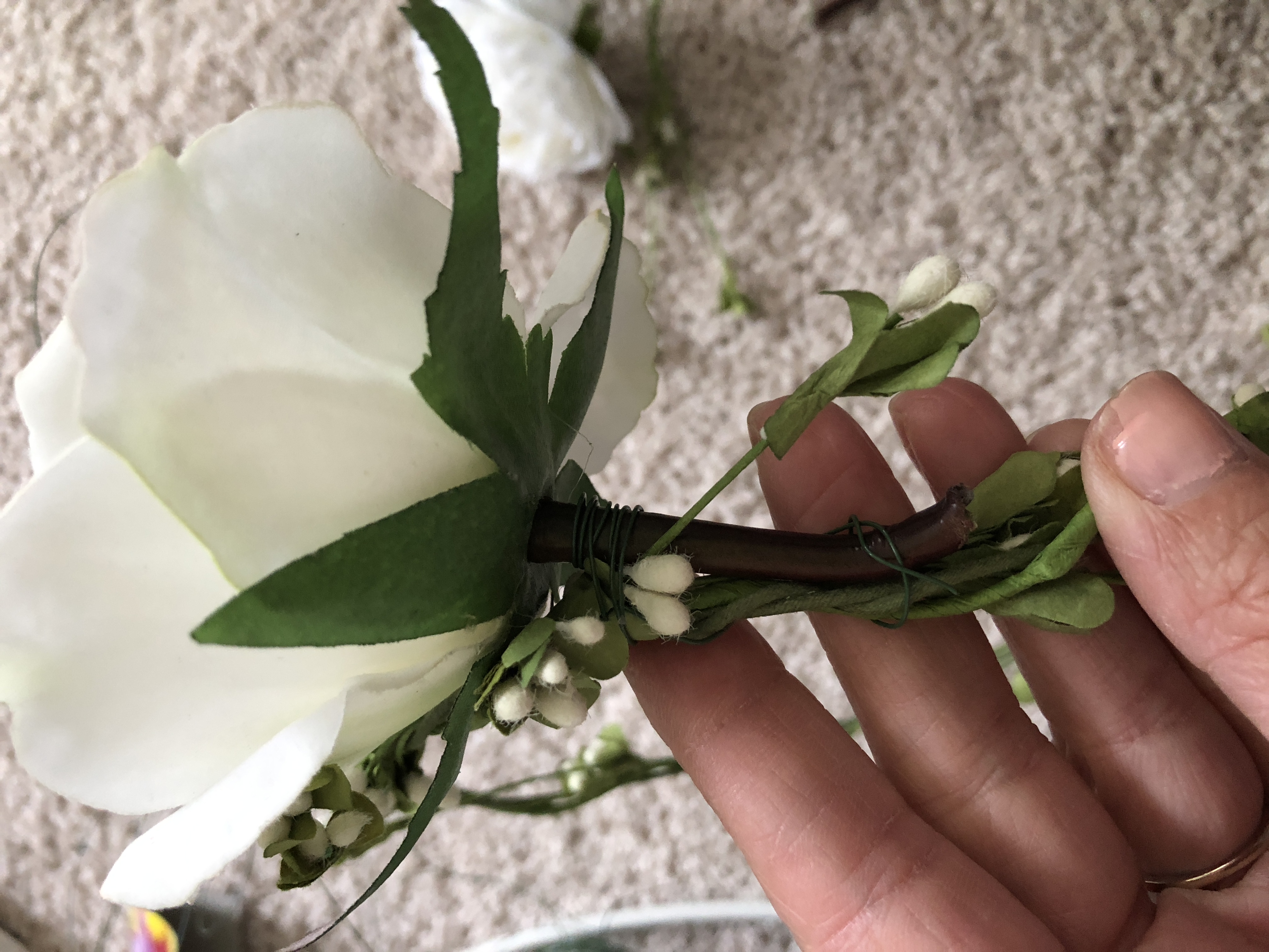 - Add greenery to the base – Starting anywhere wrap the greenery around the base. Keep adding greenery until you have covered the base. Cute off any extra. If your greenery has wire in it like mine did, you won’t need the coiled wire for this step. However, if you opt for real flowers, you will need to use the coiled wire to secure the greenery. This was a bit awkward, because I was so concerned about it looking perfect. What I learned is that it doesn’t really matter – just get the greenery on the base.
