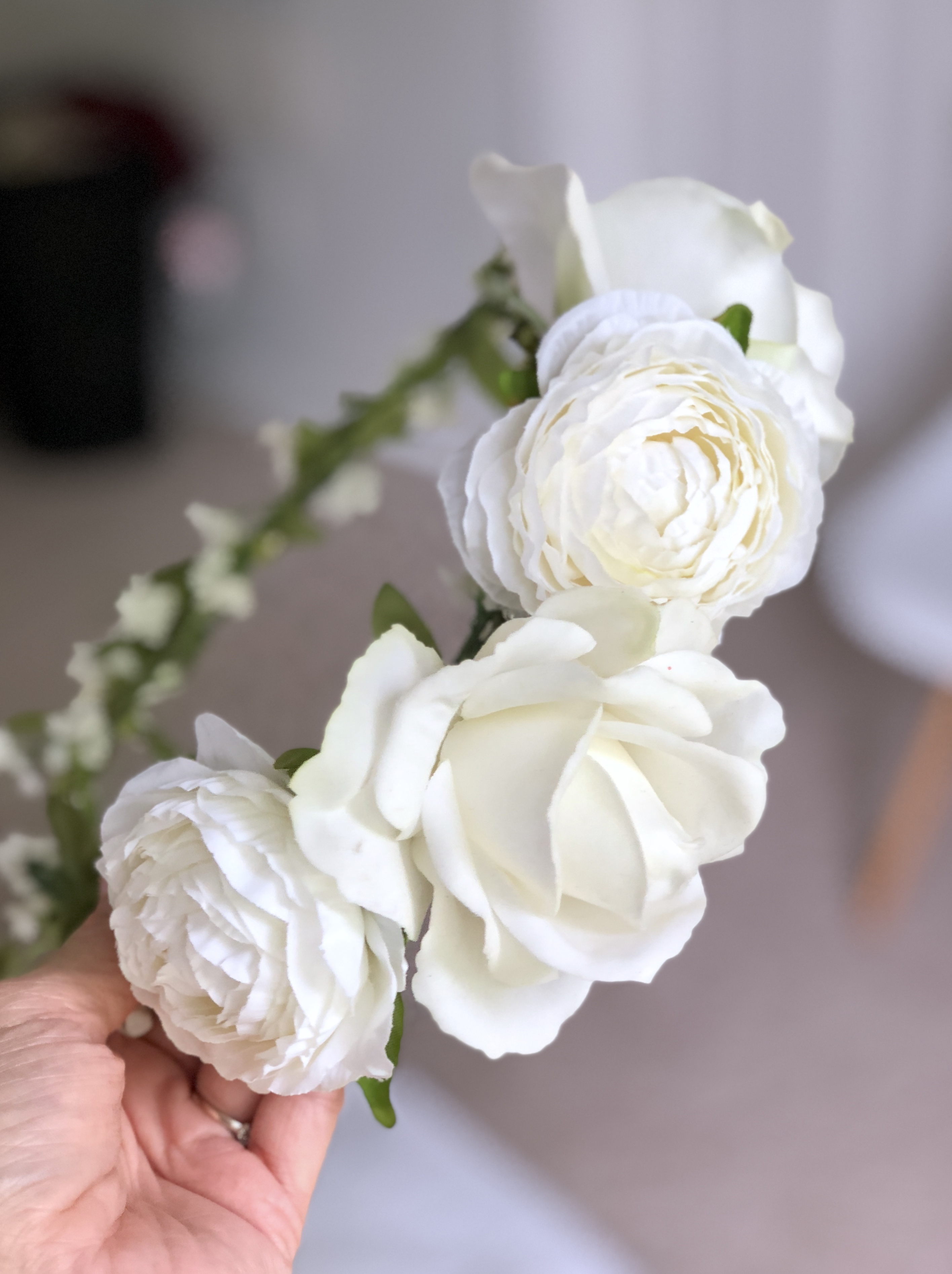 - Just keep going – Keep adding flowers until you’re happy with the overall look. I probably tried on the crown 20 times during this process to get the look I wanted. During this step make sure to there aren’t any wires poking you.