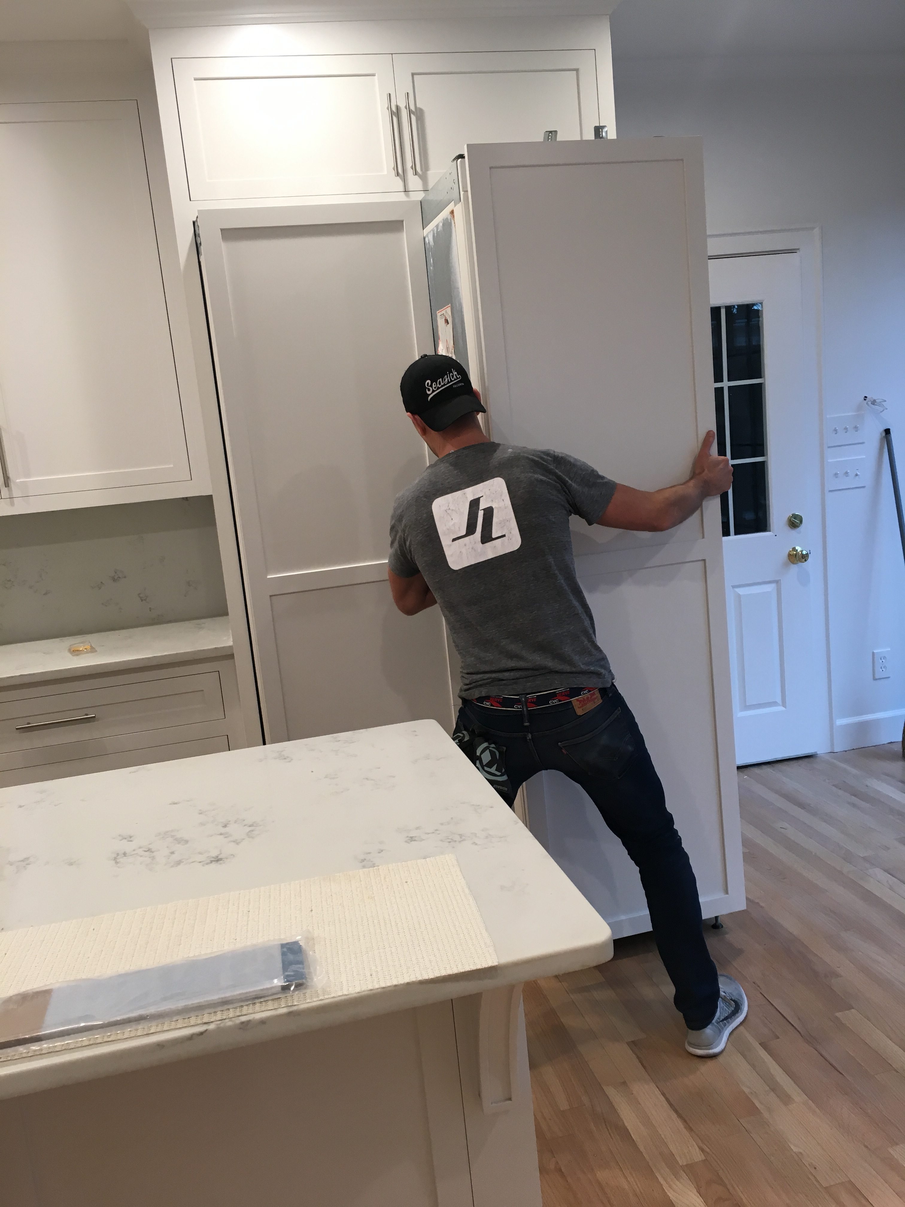 My handy hubby pushing them into place. Note: We did have them professionally installed, because these type of column units are very top heavy and MUST be bolted into place for safety.