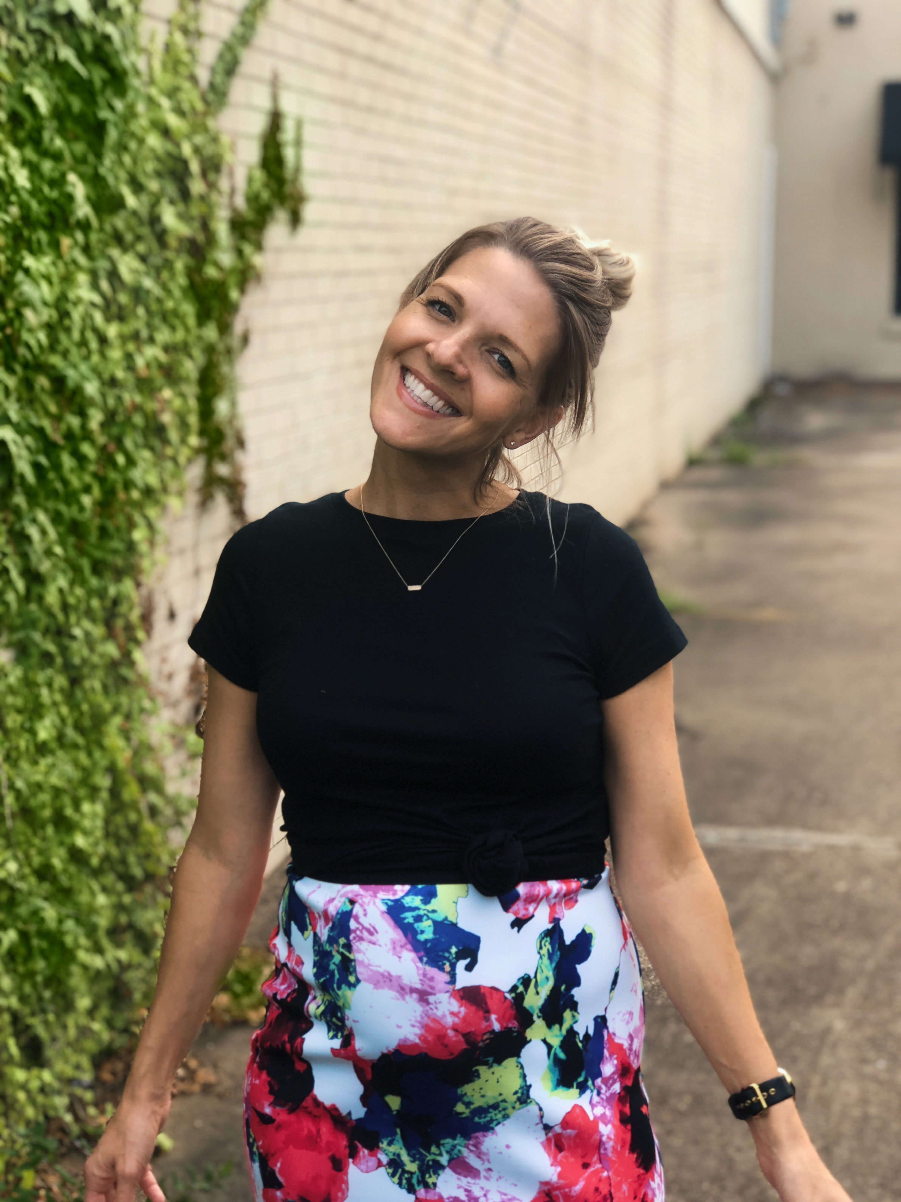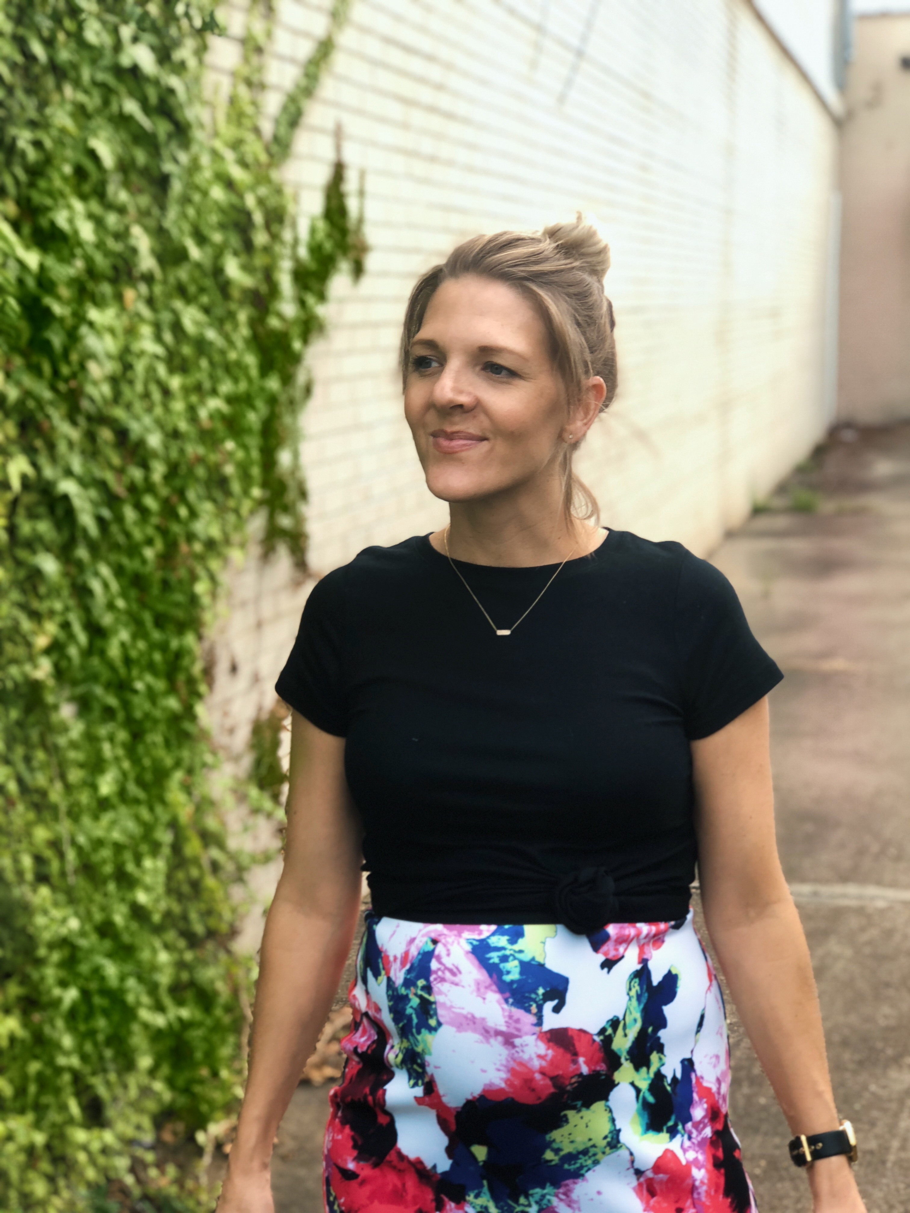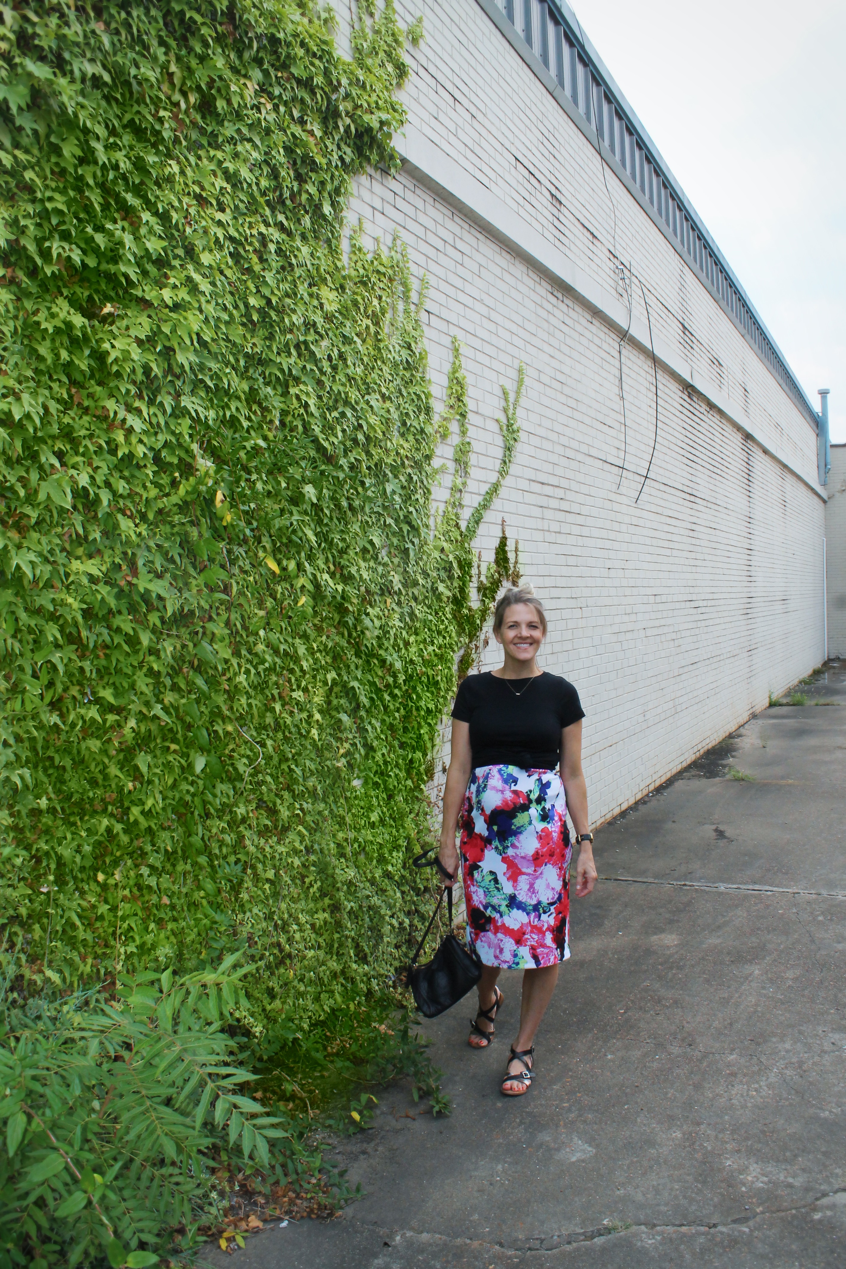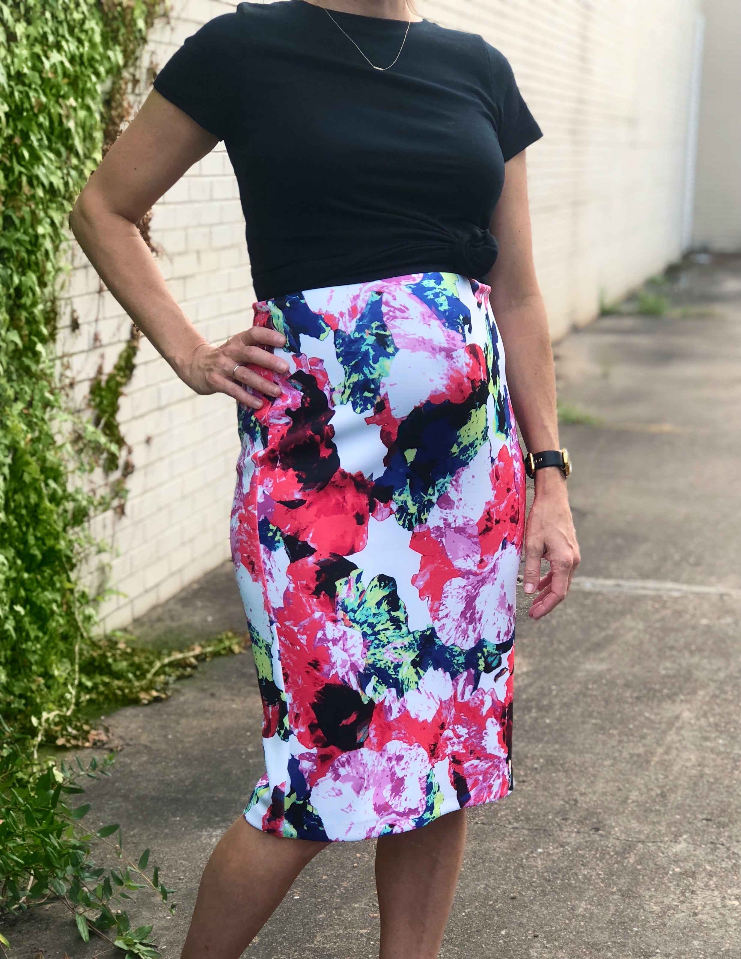 If you’re short, it makes you look taller. If you’re tall, it makes you long and slender. If you’re skinny or straight, it gives you a shape. If you’re not so skinny, it makes you look leaner. If you’re pregnant, it emphasizes the bump and distracts from the other not so magical things happening to your body. The scuba-like material of this particular skirt sucks in and smooths out EVERYTHING.