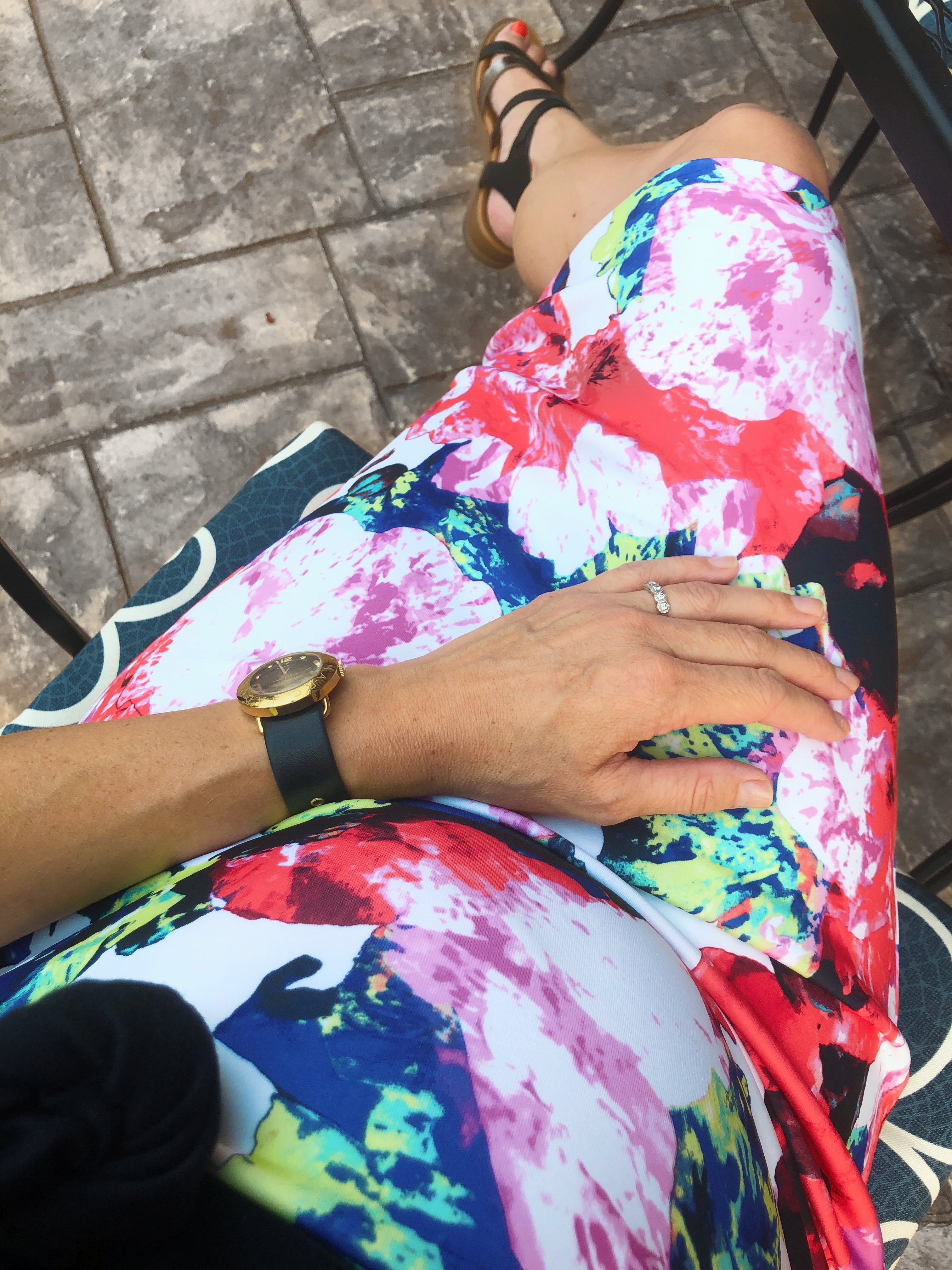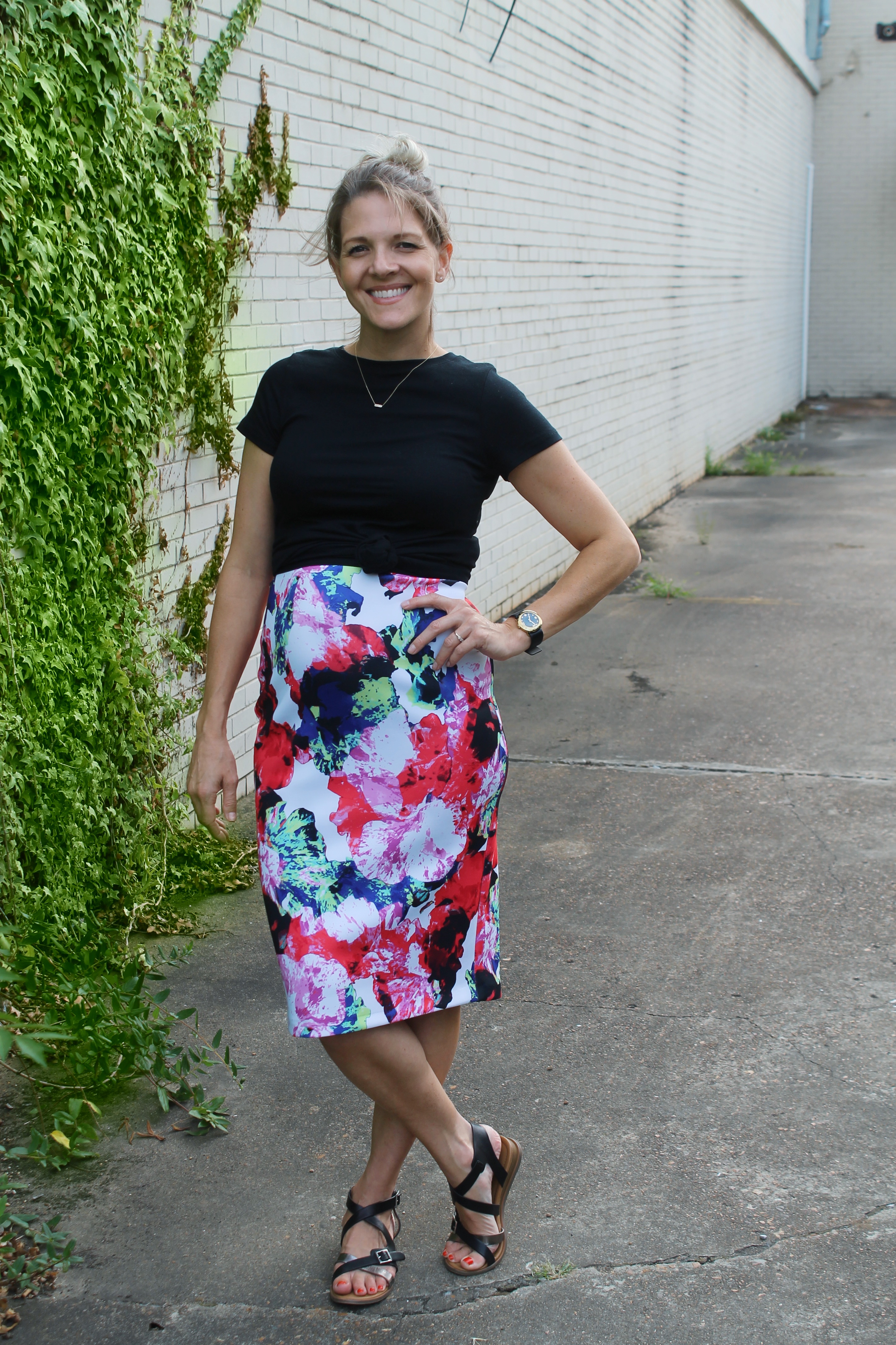 On top you can wear a tee, a nice blouse, a button down, a sweater or even sweatshirt. Down below you can wear stilettos, wedges, flats, booties, slides, or sneakers. Almost anything looks good giving this skirt a ton of versatility – more on that in the next point. On this casual date night I wore it with a tee and sandals, because I had a grand total of 10 minutes to get ready.