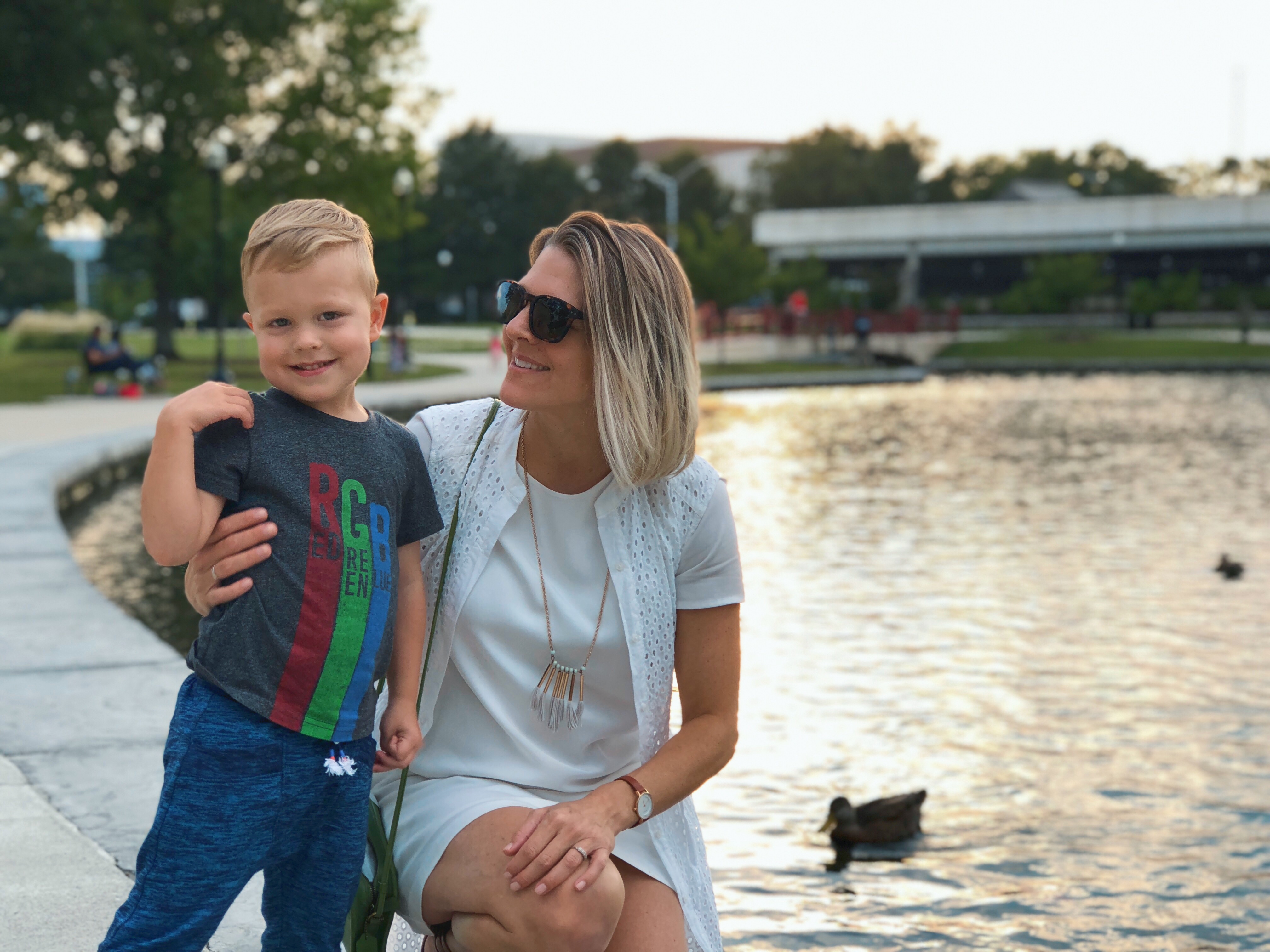 This rebellious all white white outfit is head to my swollen pregnant toe thrifted. I wore it on a family date night to Pan e Vino for pasta and pizza, and then and Big Spring Park to feed the ducks. It was pretty much the perfect night…until Maxwell took an accidental dip whilst throwing duck food. Luckily we had beach towels in the car and he was dressed in thrifted threads – obvs!