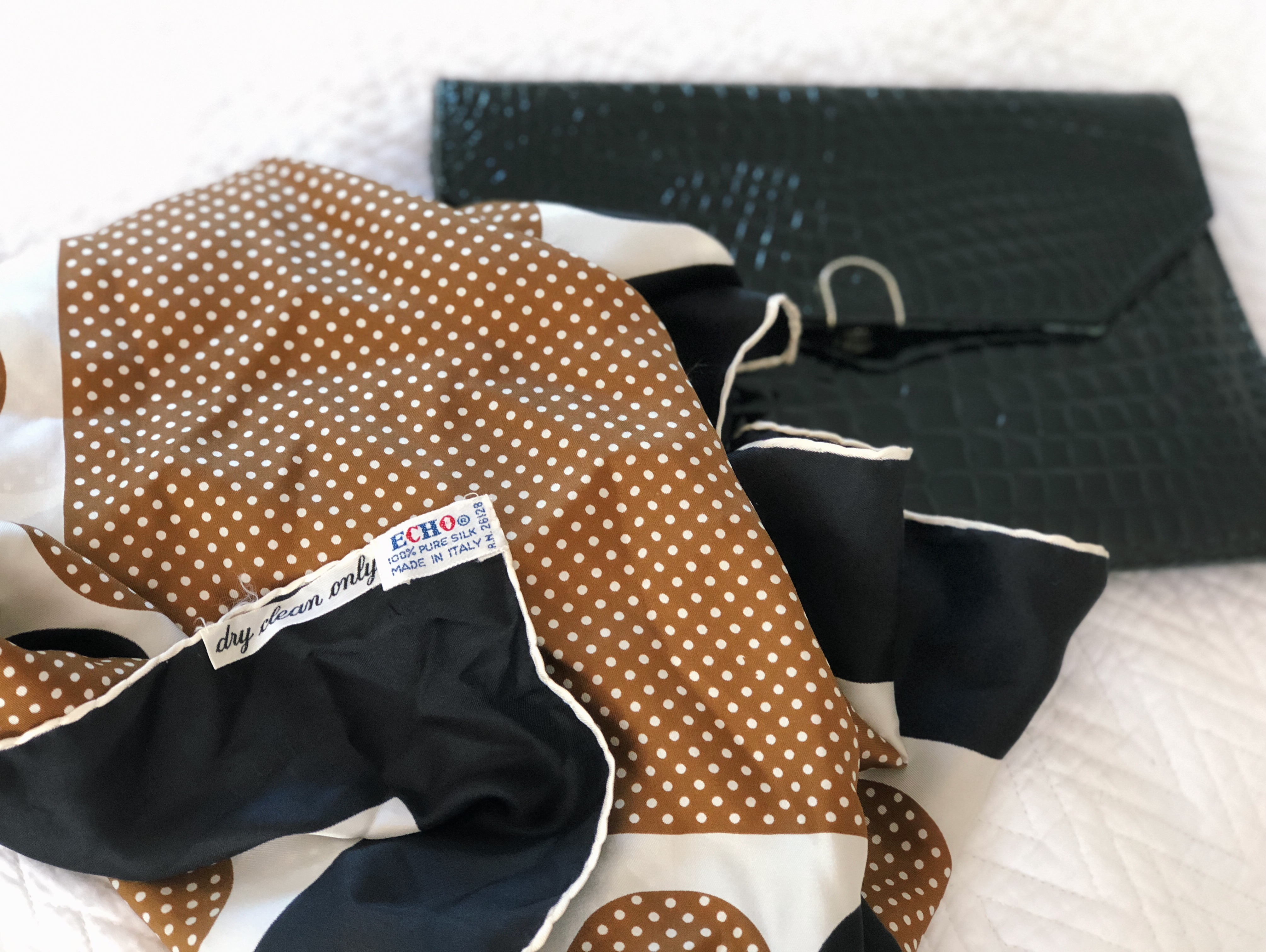 I wanted to add another animal element, so I’m carrying a faux alligator patent leather bag ($7). This has been such a great staple in my wardrobe. It has been to weddings, date nights, etc. Animal print makes me want to wear a lot of bangles, buuuut bangles drive me nuts, so I tied this vintage silk Echo scarf ($2) around my wrist.
