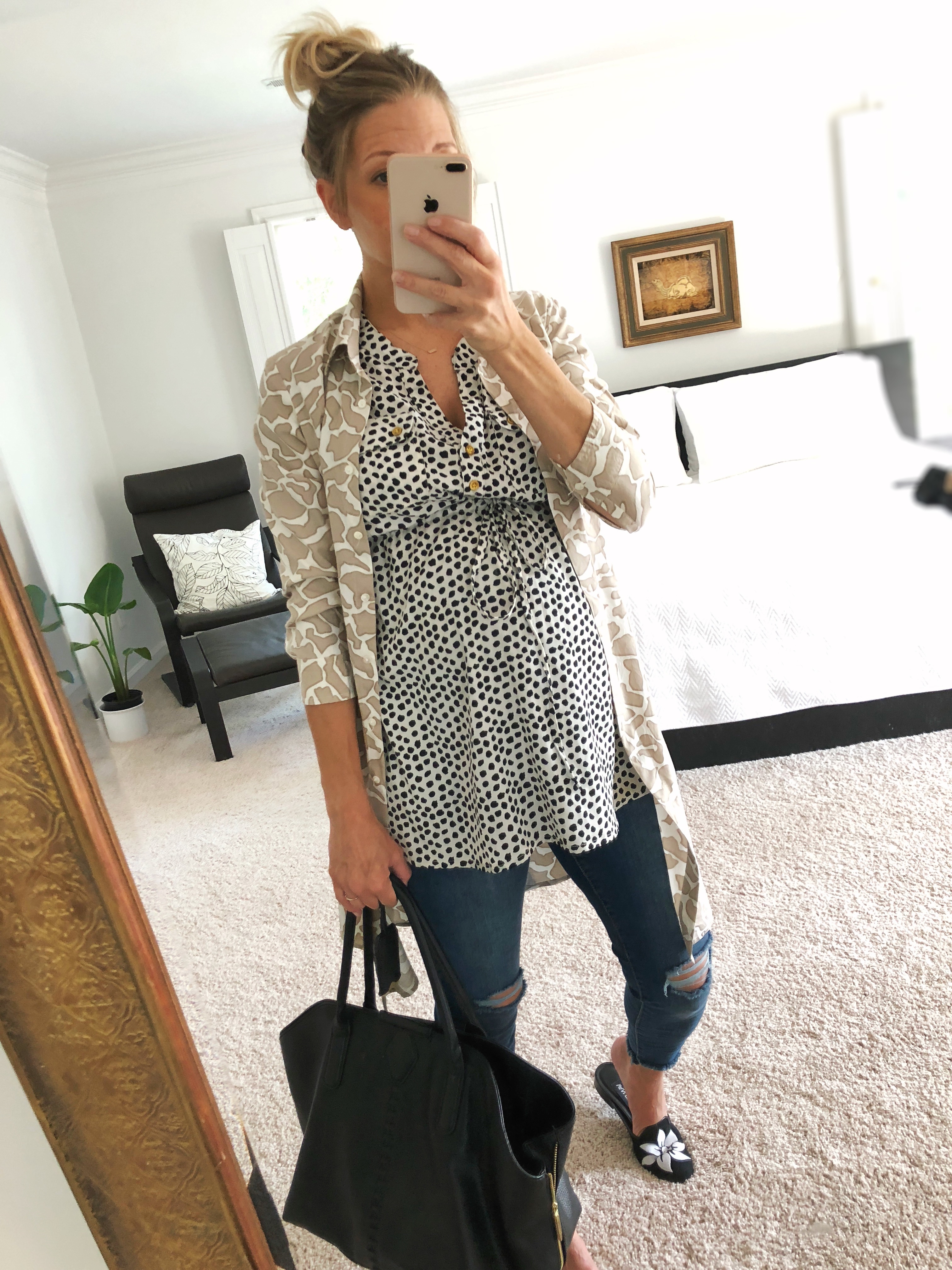 This dress is Merona and definitely not maternity, and thus it sort looks like a long shirt. I love it because the print is really bold and almost cartoon-like (oh and it was $5). We’re usually inclined to put on tights or just shoes with a dress. I obviously need more coverage, but even if you don’t, try a pair of jeans for an unexpected combo. I thrifted these Gap maternity ones for $3. About a minute before I snapped this pic, I cut the hem off for a cooler length – it’s very convenient that raw hems are still a thing.