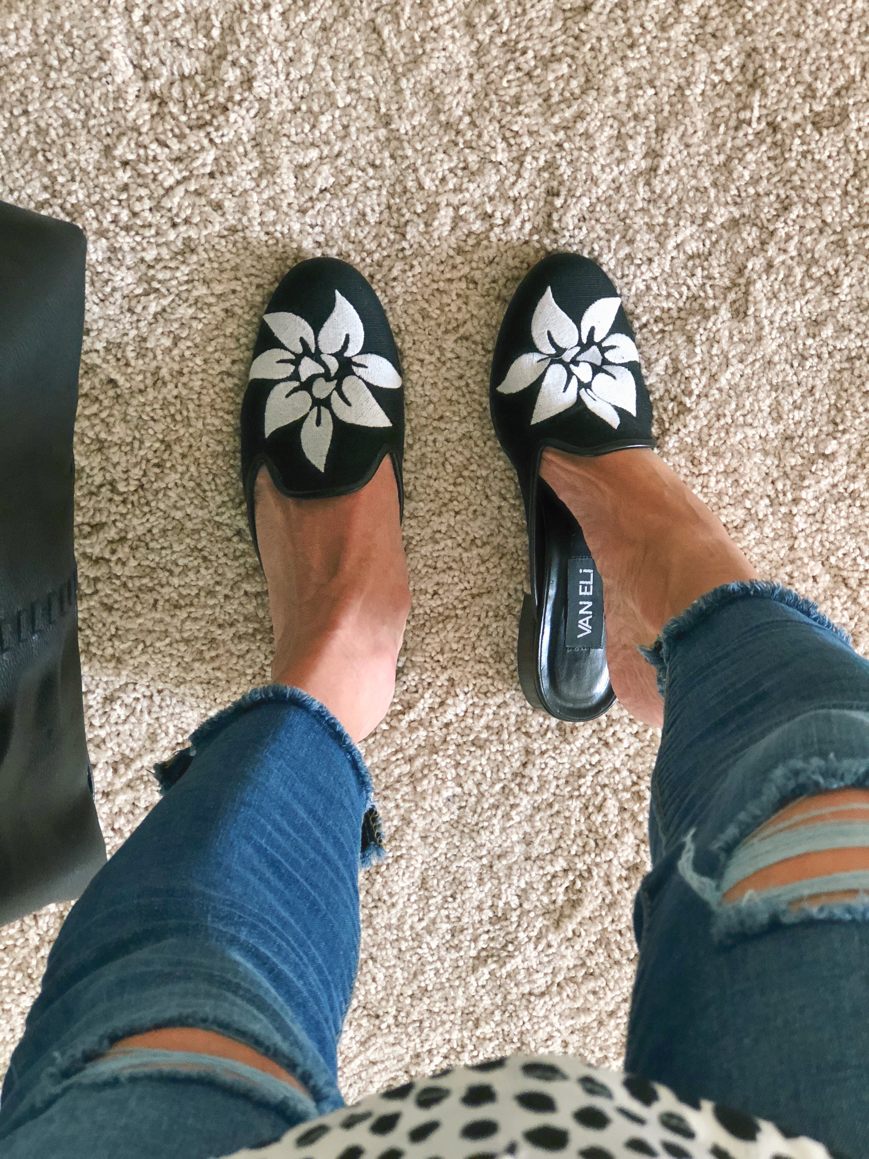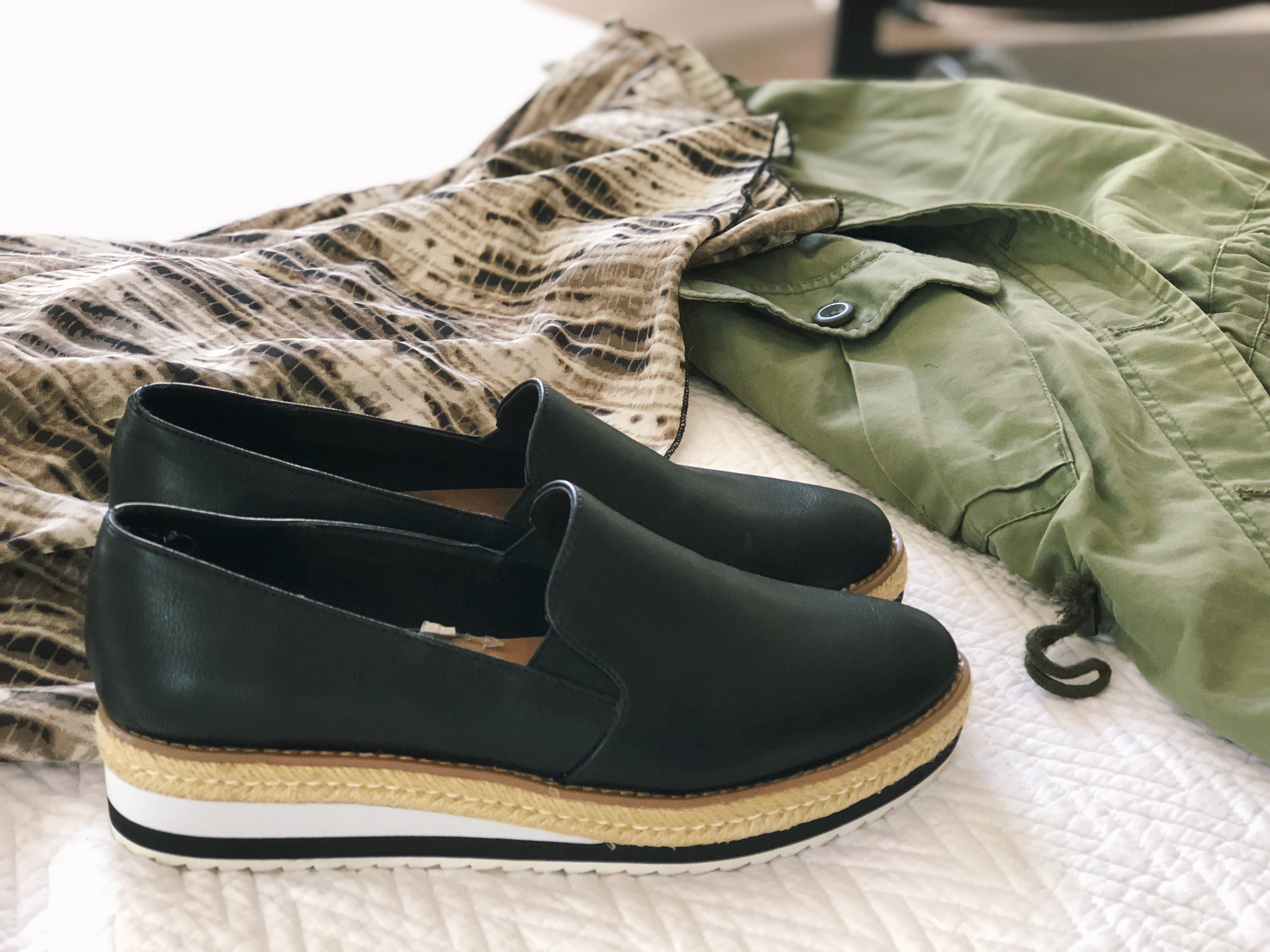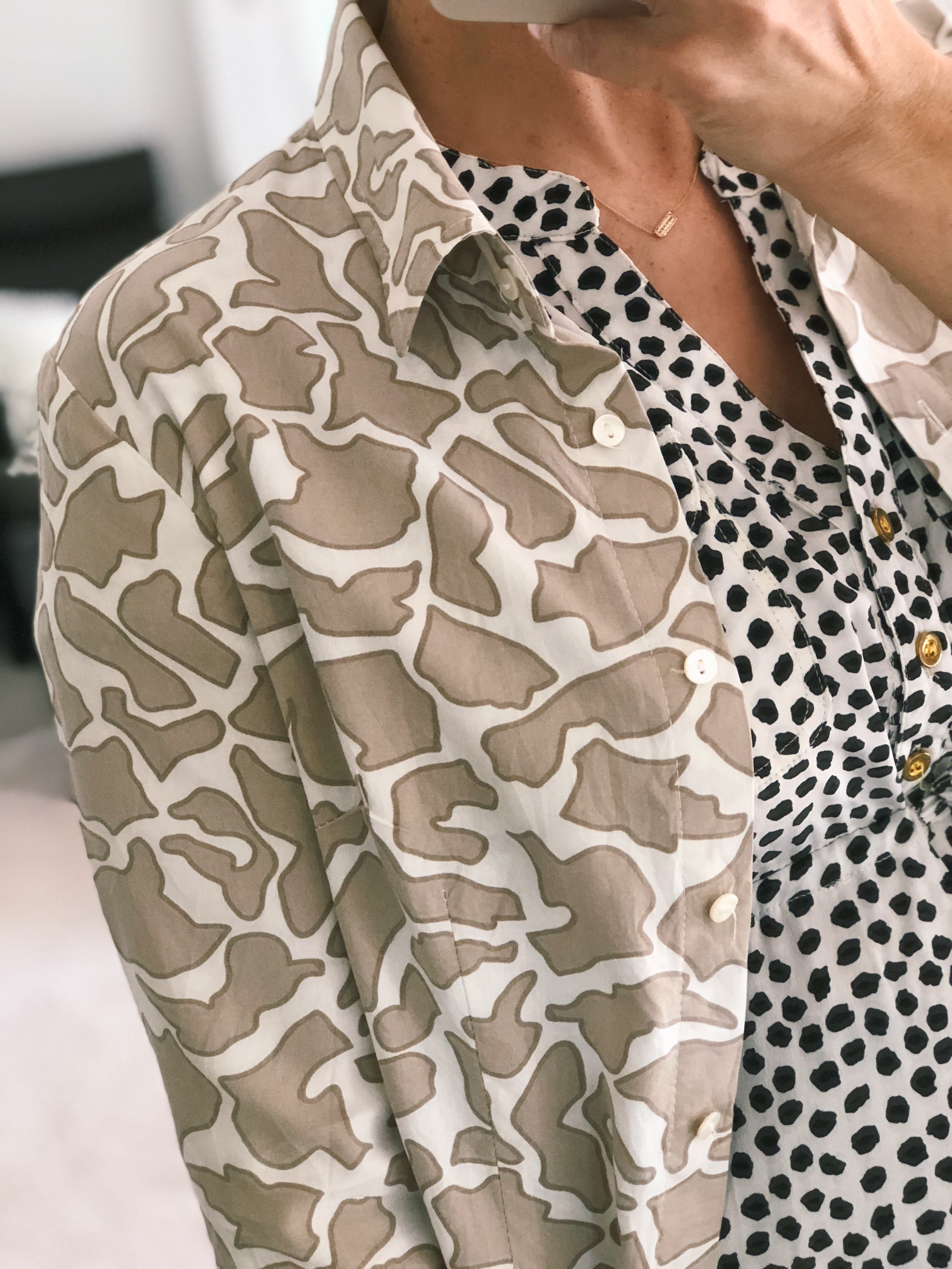 I decided to add this vintage giraffe shirt dress ($8) and it started to become a look. I know mixing prints can be scary, but it’s pretty easy working with neutrals. Just start trying things together until you find something that doesn’t make you cringe. I finished the look with some thrifted black and white Vaneli slides ($3) and a gifted Philip Lim black tote.