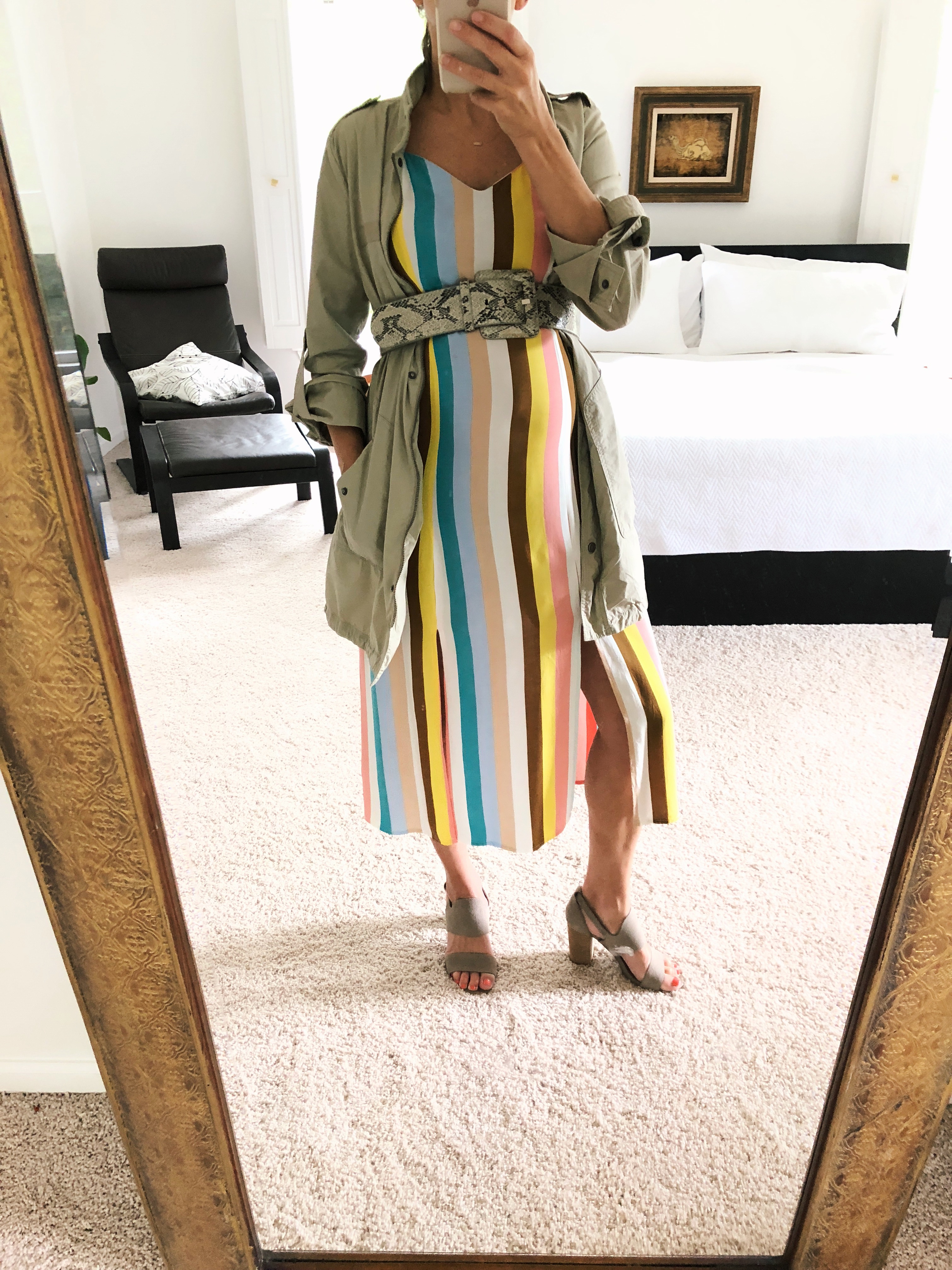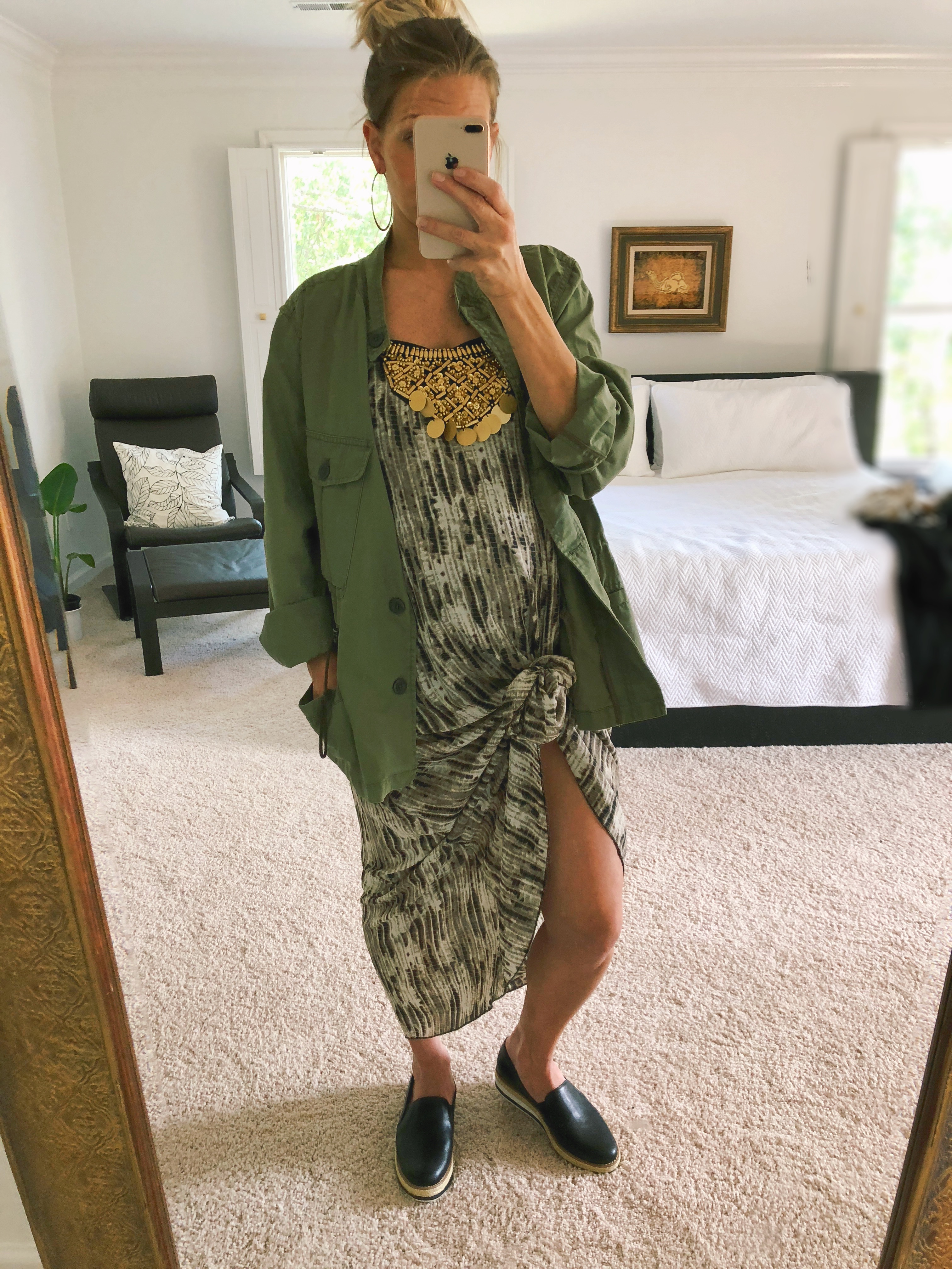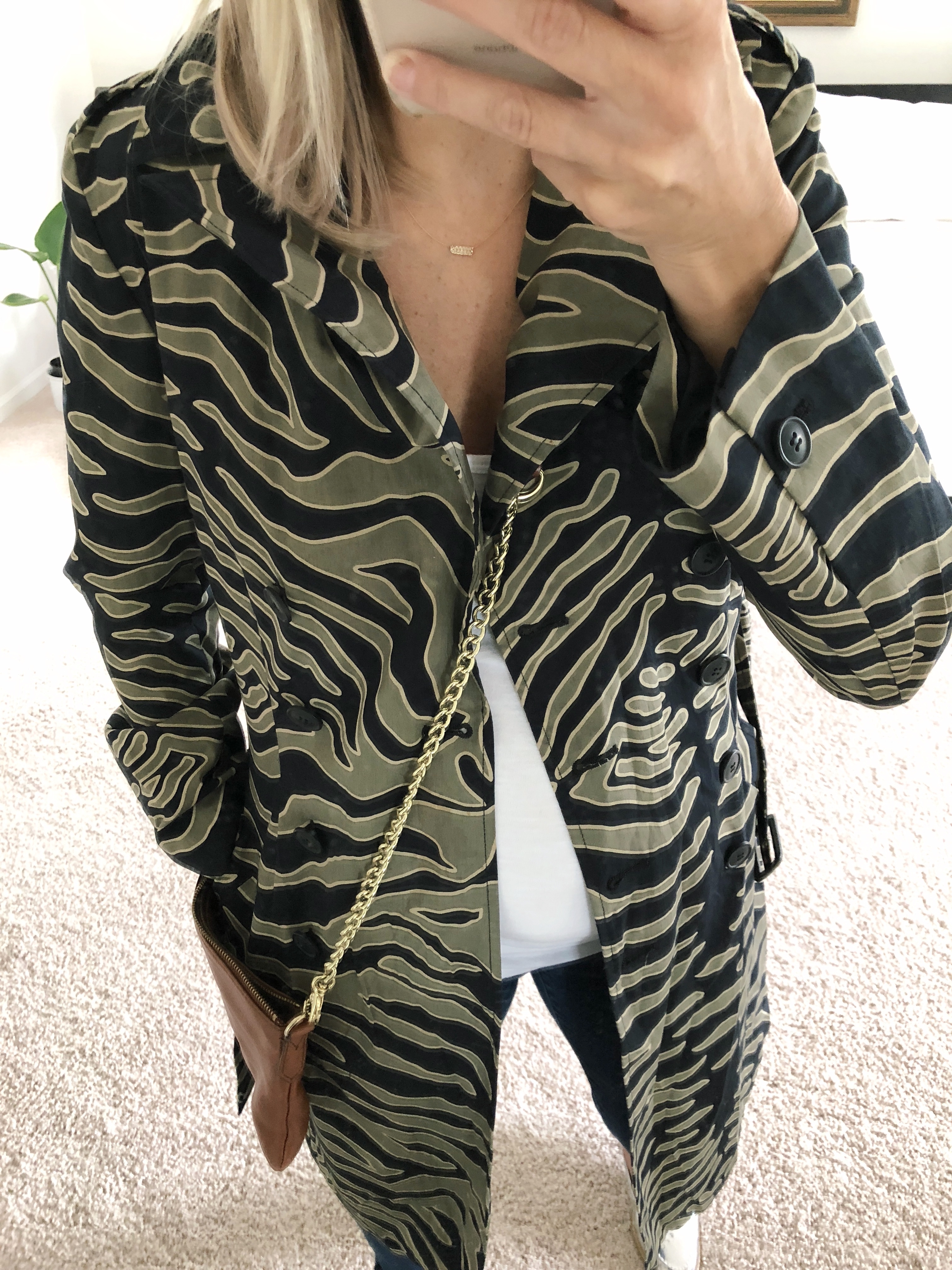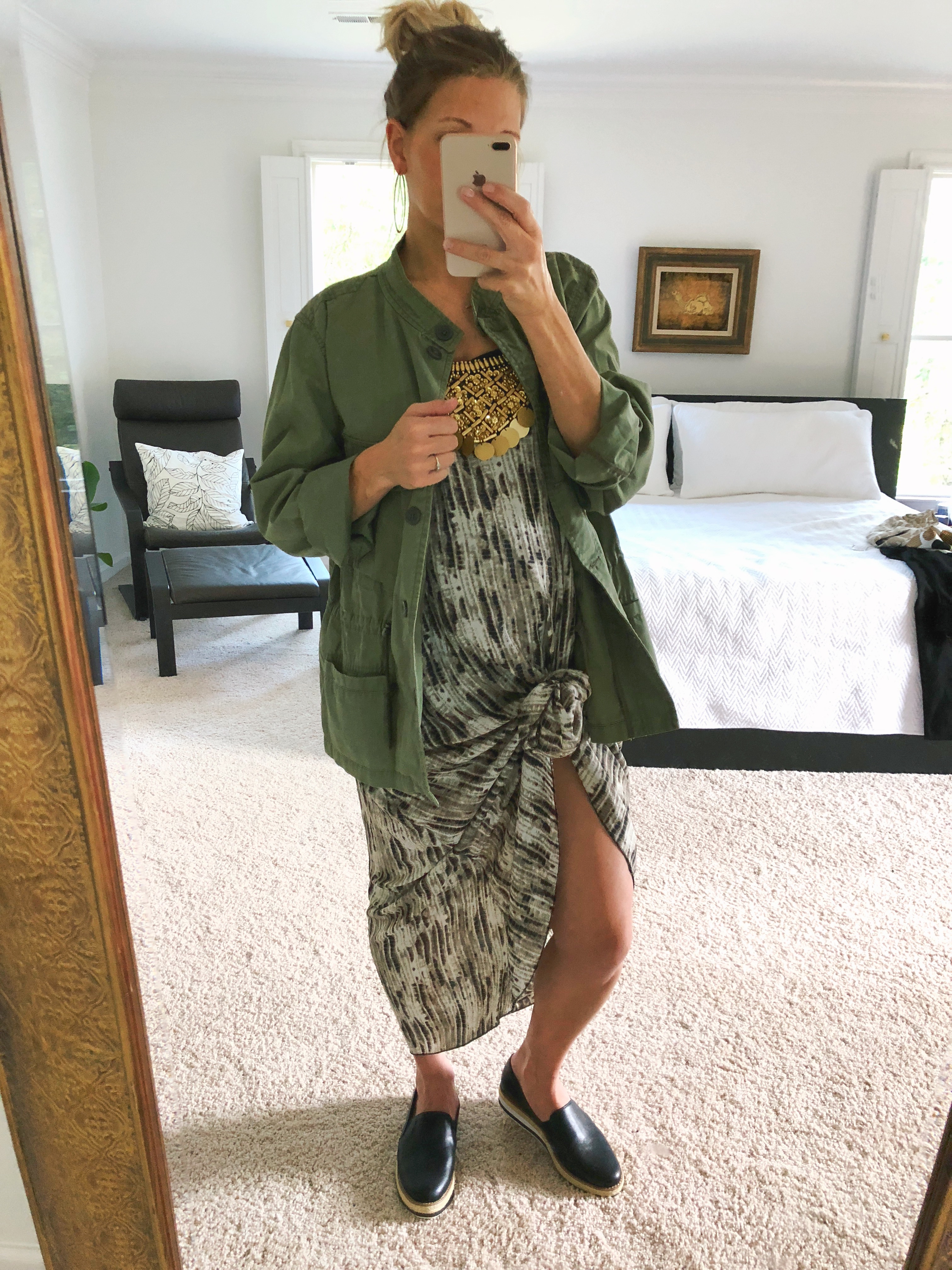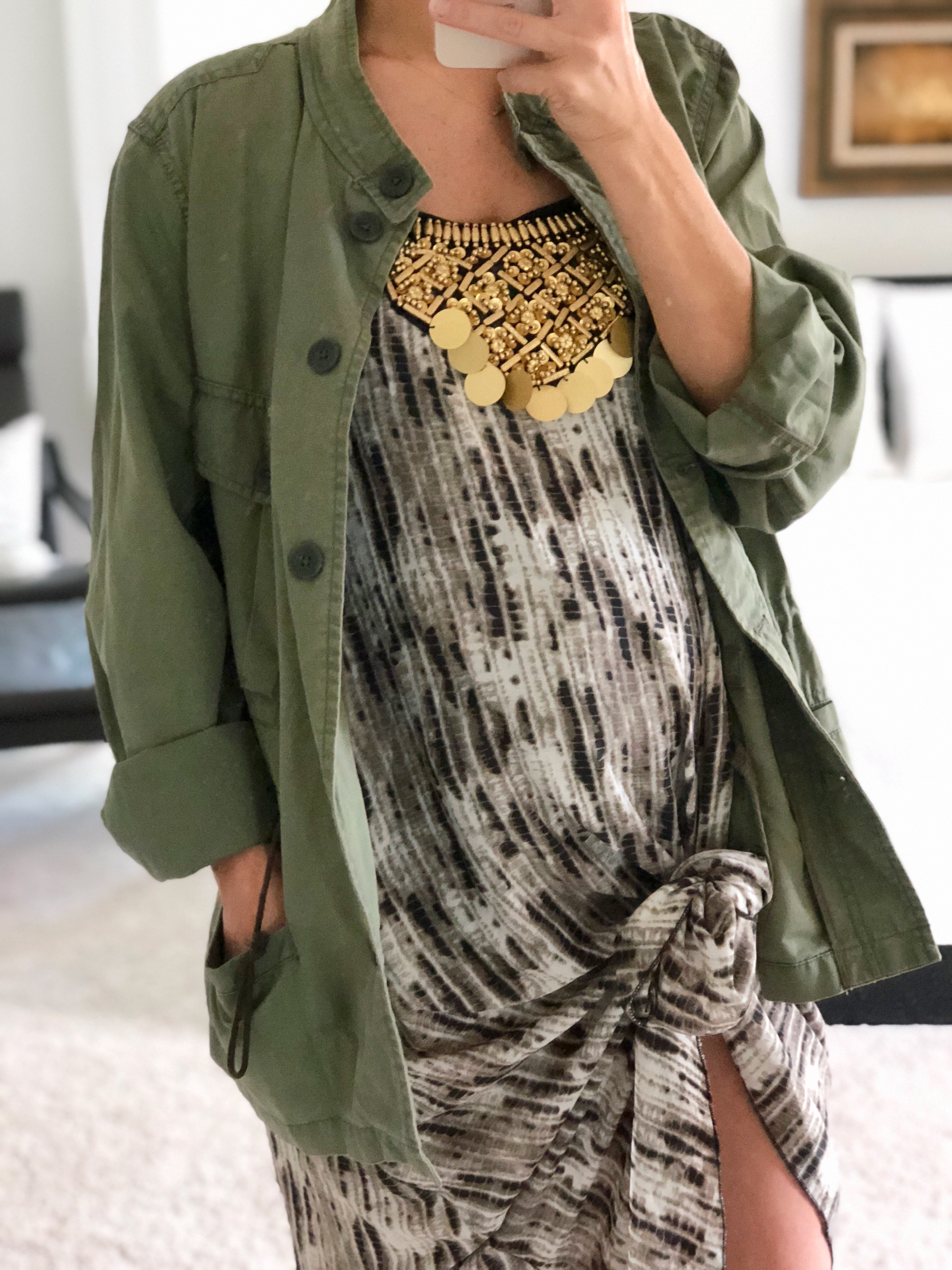 So the dress isn’t exactly animal print, but it has that vibe. The brand is Boohoo and if memory serves me right it was $6. This gold necklace thing is actually part of the dress. I almost tossed it because the straps are weird. To remedy that, I added this Gap oversized army green jacket. If you’re going for oversized, really go for it. This is an extra large.