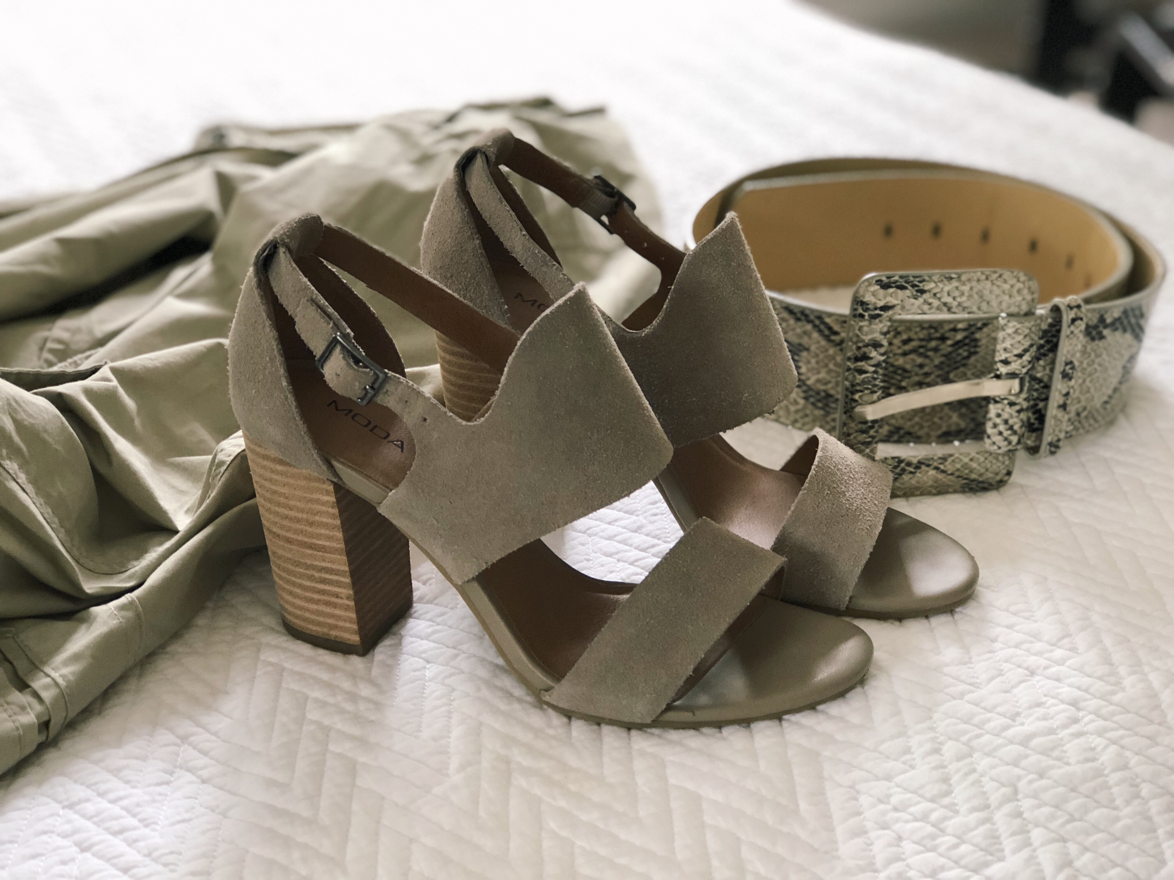 I’m in favor of anything that adds versatility to my clothes, and this belt (along with the jacket) takes this lil sundress right into Fall. Also, wearing it over vs. under the jacket make it a little more interesting. The dress wasn’t thrifted, but everything else was. I hunted this wide leather belt for $2 (brand unknown) and this casual Target khaki jacket for $10. I tried it with with both block heels (thrifted for $12) and white sneakers (had to buy these new, sorry!), and both work.