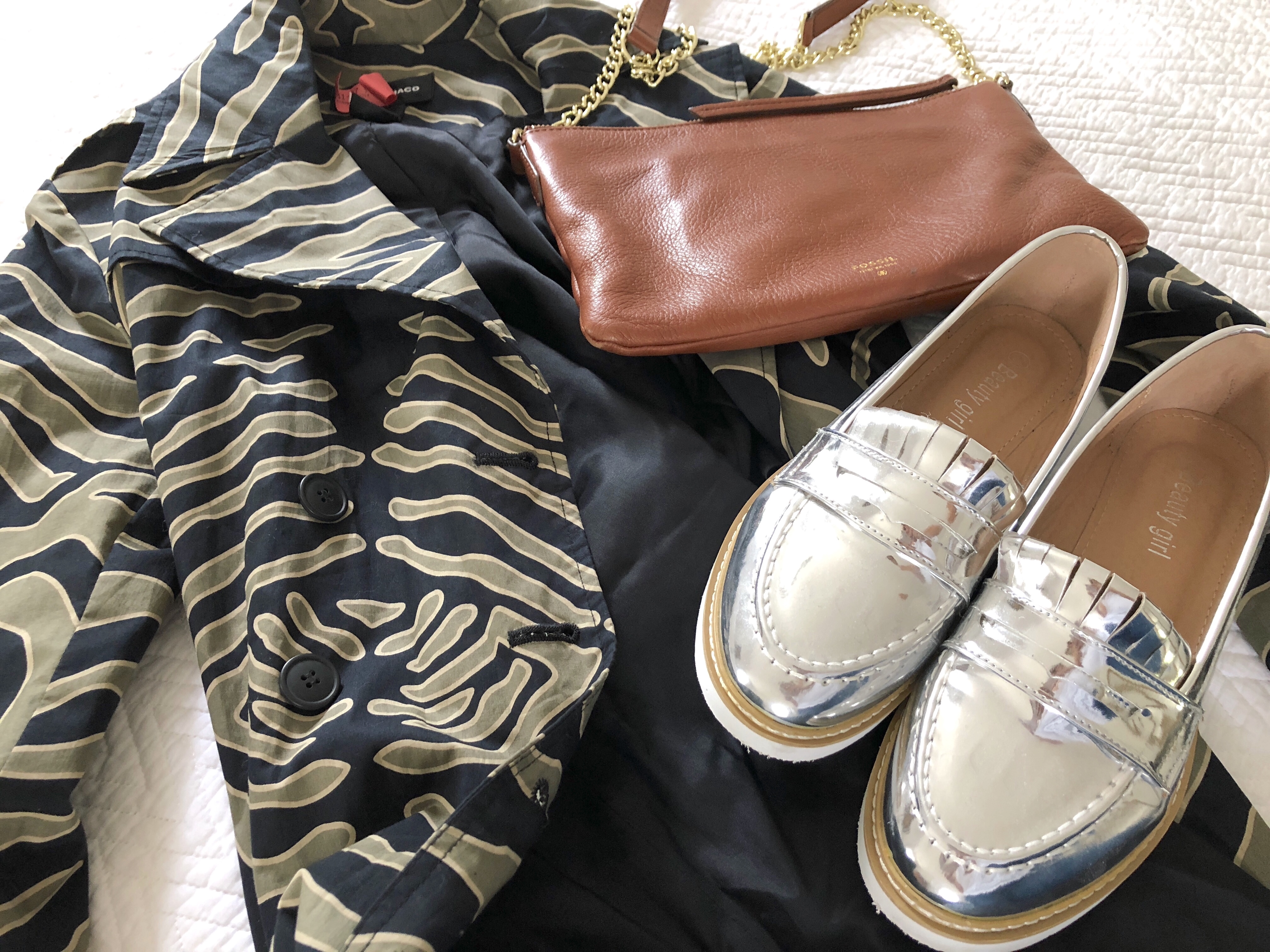 Another trend at NYFW was flashy fabrics during the day. To play off that I put on these silver loafers ($8), and a Fossil brown cross body ($50) with a gold chain – ALL THRIFTED!