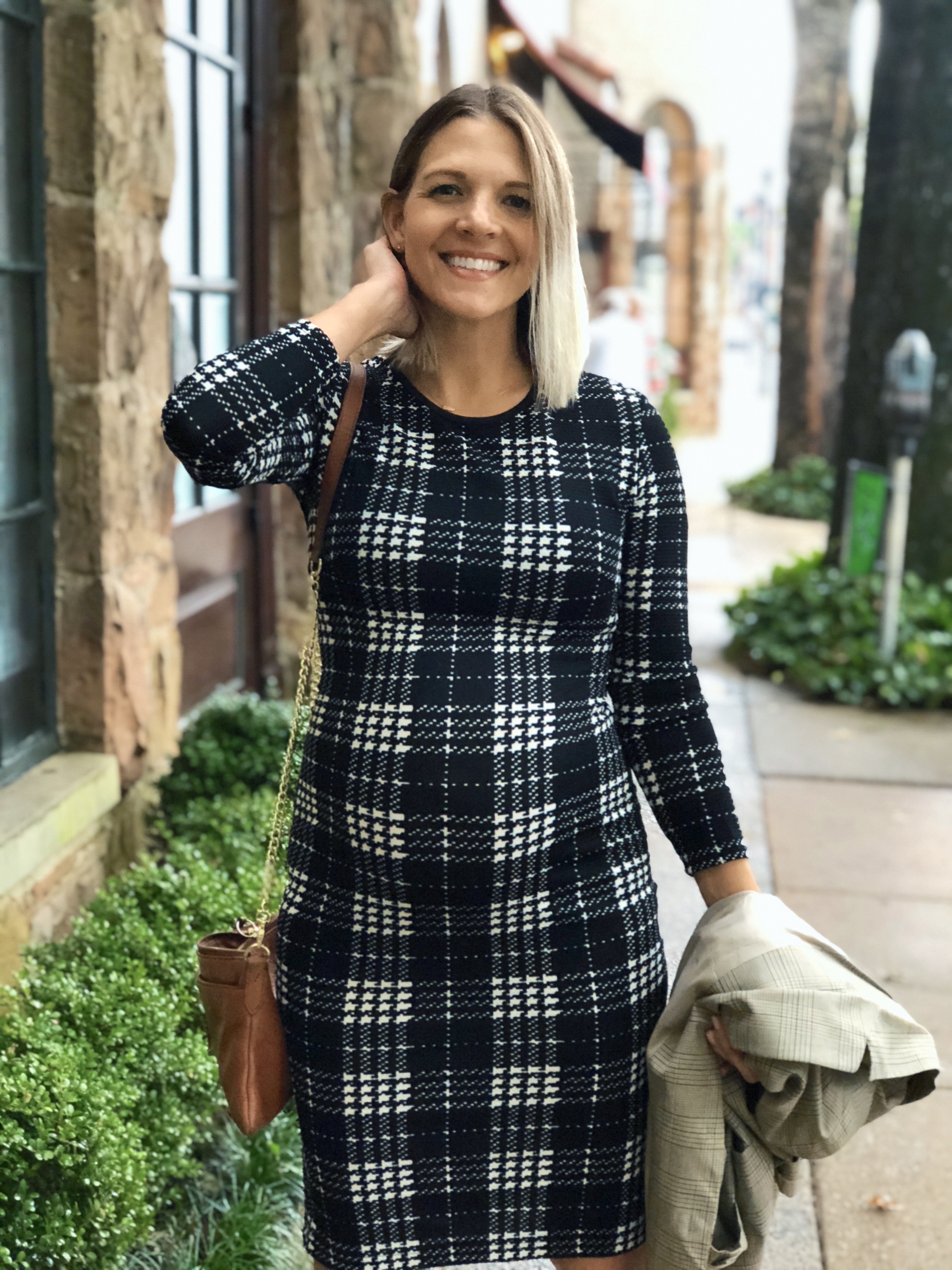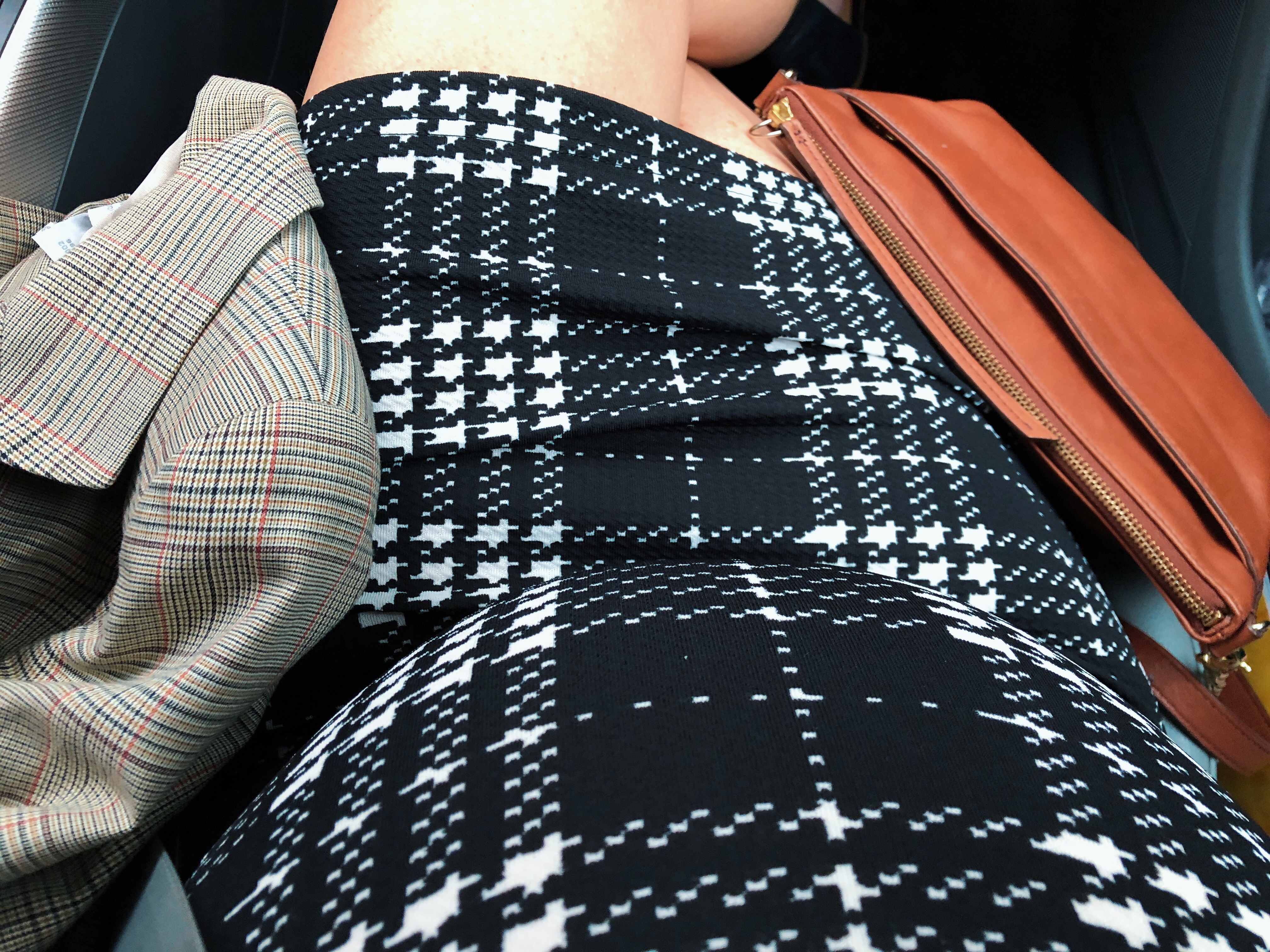 For some interest, I added another pattern – a vintage tan blazer ($1, yes I purchased this for a mere dollar). I kept the accessories simple – brown Fossil cross body bag ($40), a gold bracelet ($6) and pearls…I lied these were also not thrifted, but I had to wear pearls, right?