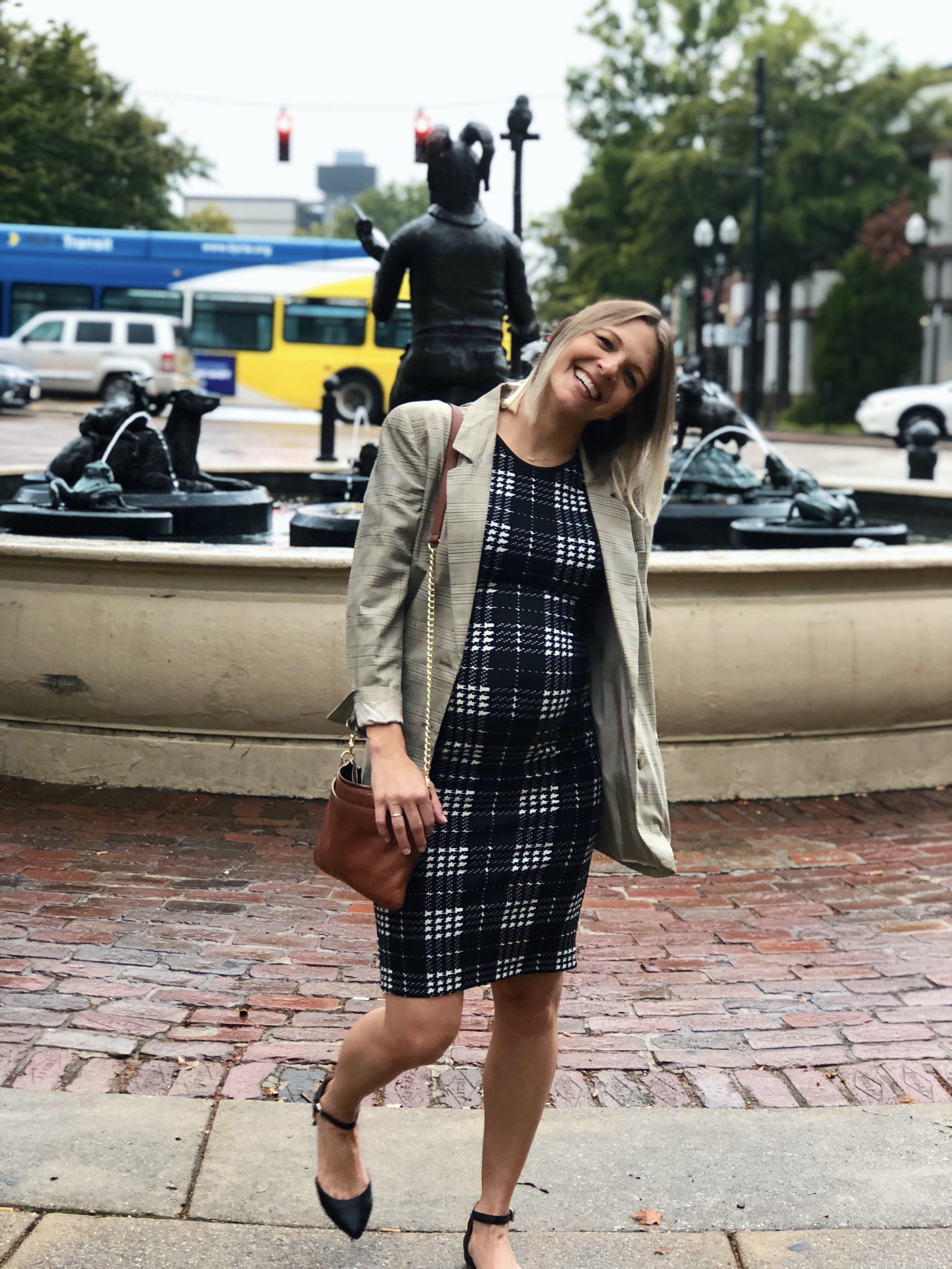I wore this conservative no brand black and white printed dress ($8). It’s not maternity, so I said a prayer that the seams were strong as a stretched it over my 6 month bump. Luckily, there were no wardrobe malfunctions. My shoes are the only thing not thrifted.